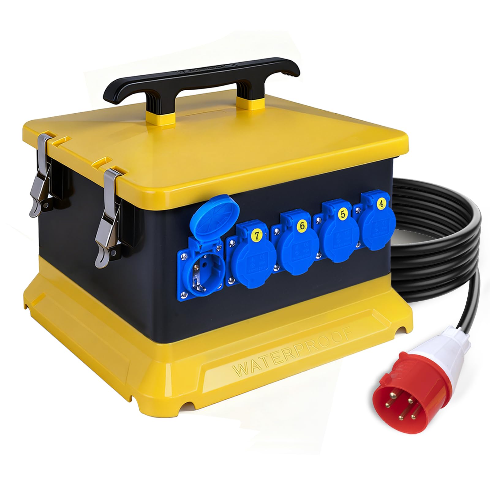 - Diverse possibilità di collegamento: 6 prese Schuko (16 A), 1 presa CEE 16 A, 1 presa CEE 32 A, 1 interruttore a levetta 3P + N 100 A, 1 interruttore 3P 16 A, 1 interruttore 3P 32 A; 6 interruttori automatici da 16 A.