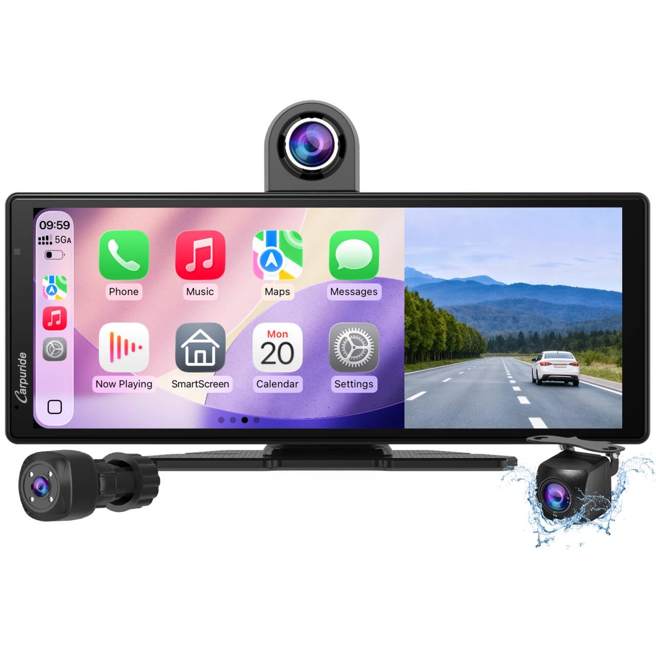 - 【Schermo di navigazione per auto Carpuride Three Cam】 Dotato di una telecamera anteriore 4K, una telecamera a infrarossi 1080P e una telecamera posteriore 1080P. Il grandangolo da 170° copre l'intero abitacolo. Registra a colori di giorno e passa automaticamente al bianco e nero a infrarossi di notte per riprese nitide anche in condizioni di scarsa illuminazione. Doppia telecamera anteriore ruotabile di 350° con regolazione verticale, adattabile a diversi veicoli. Ideale per le famiglie: telecamera a infrarossi cablata per auto per monitorare i bambini sui sedili posteriori in tempo reale.