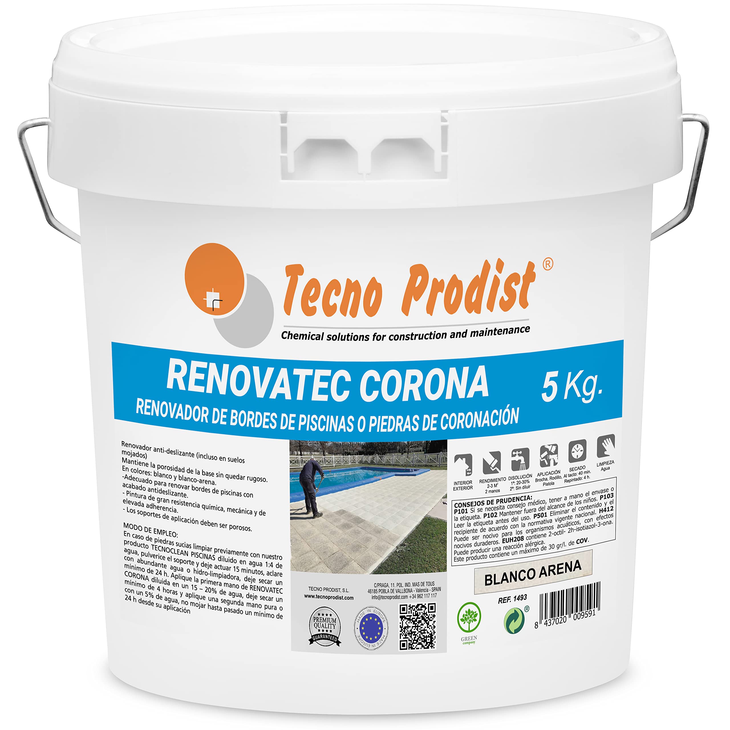 - RENOVATEC CORONA è una pittura specifica per il rinnovo dei bordi piscina, ideale per la pietra di coronamento, disponibile nei colori bianco e bianco sabbia, simili alla tonalità originale di queste pietre.