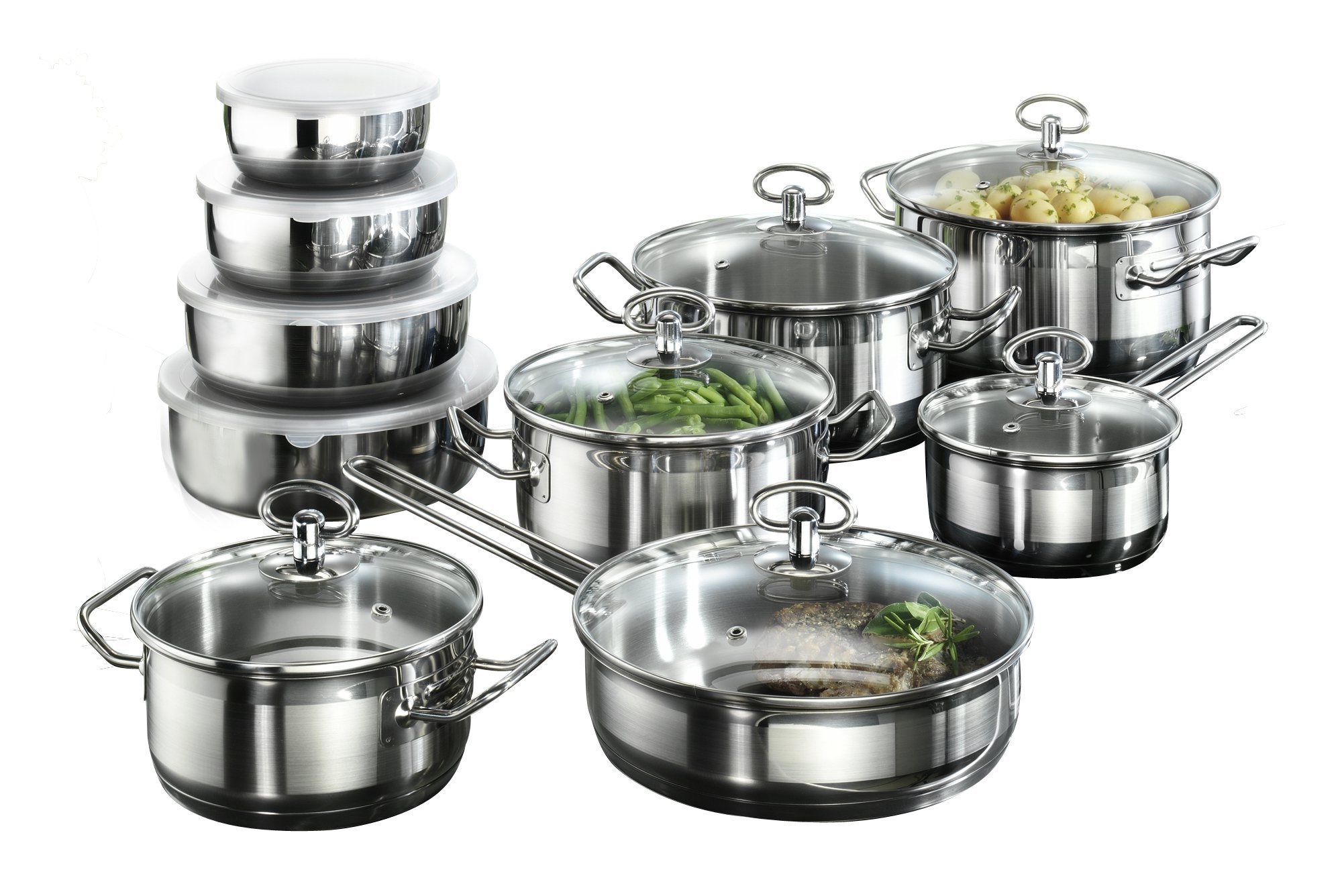 - Include: 1 casseruola con manico e coperchio in vetro (14 cm); 4 pentole con coperchio in vetro (16 cm, 18 cm, 20 cm, 22 cm); 1 tegame da stufato con coperchio in vetro (22 cm); 4 ciotole con coperchio (20 cm, 18 cm, 15 cm, 13 cm).