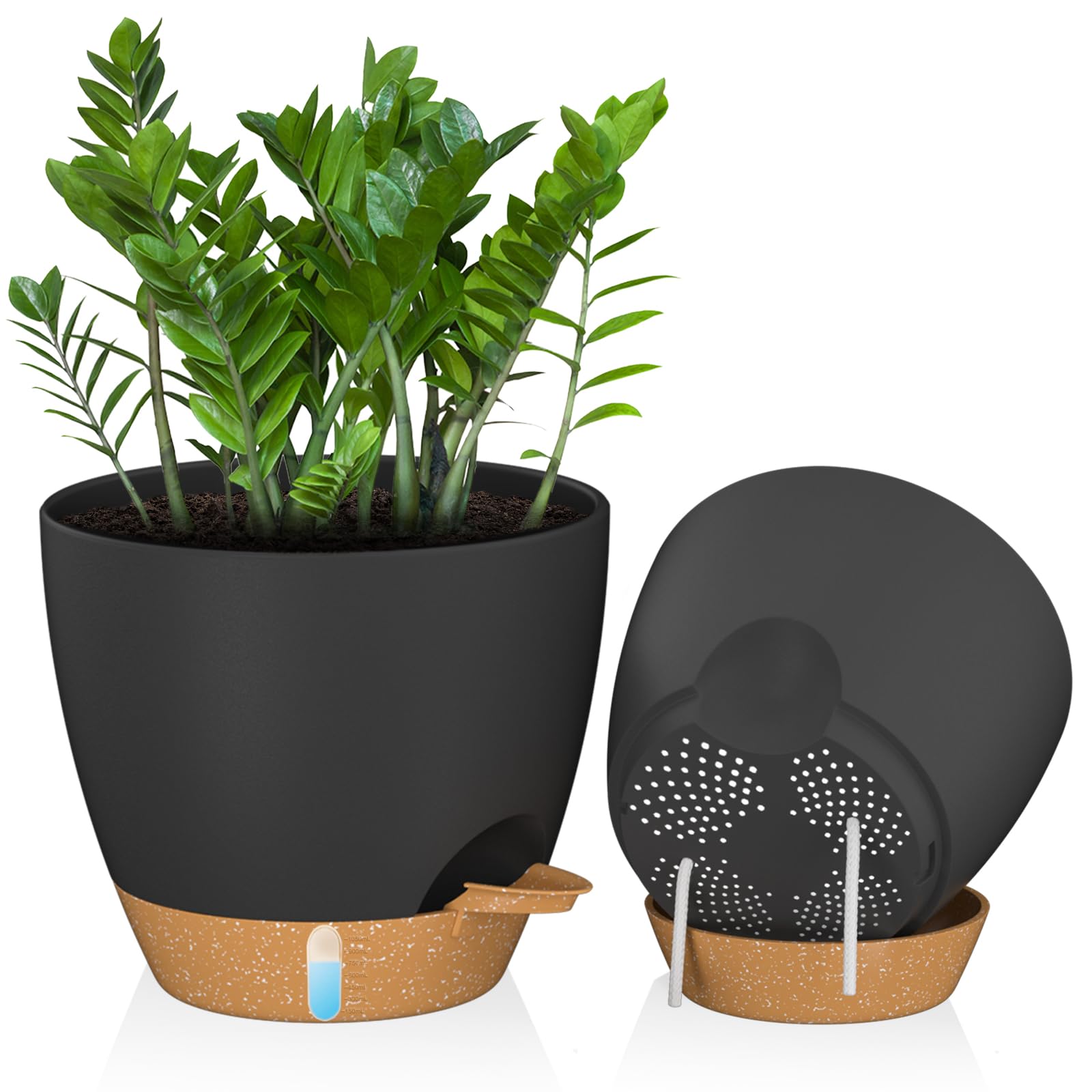 - Fori di Drenaggio e Auto-irrigante: Fori di drenaggio prevengono ristagno e marciume radicale. La corda di cotone assorbe acqua dal sottovaso, mantenendo il terreno umido. Evita irrigazione eccessiva o scarsa, ideale per chi viaggia.