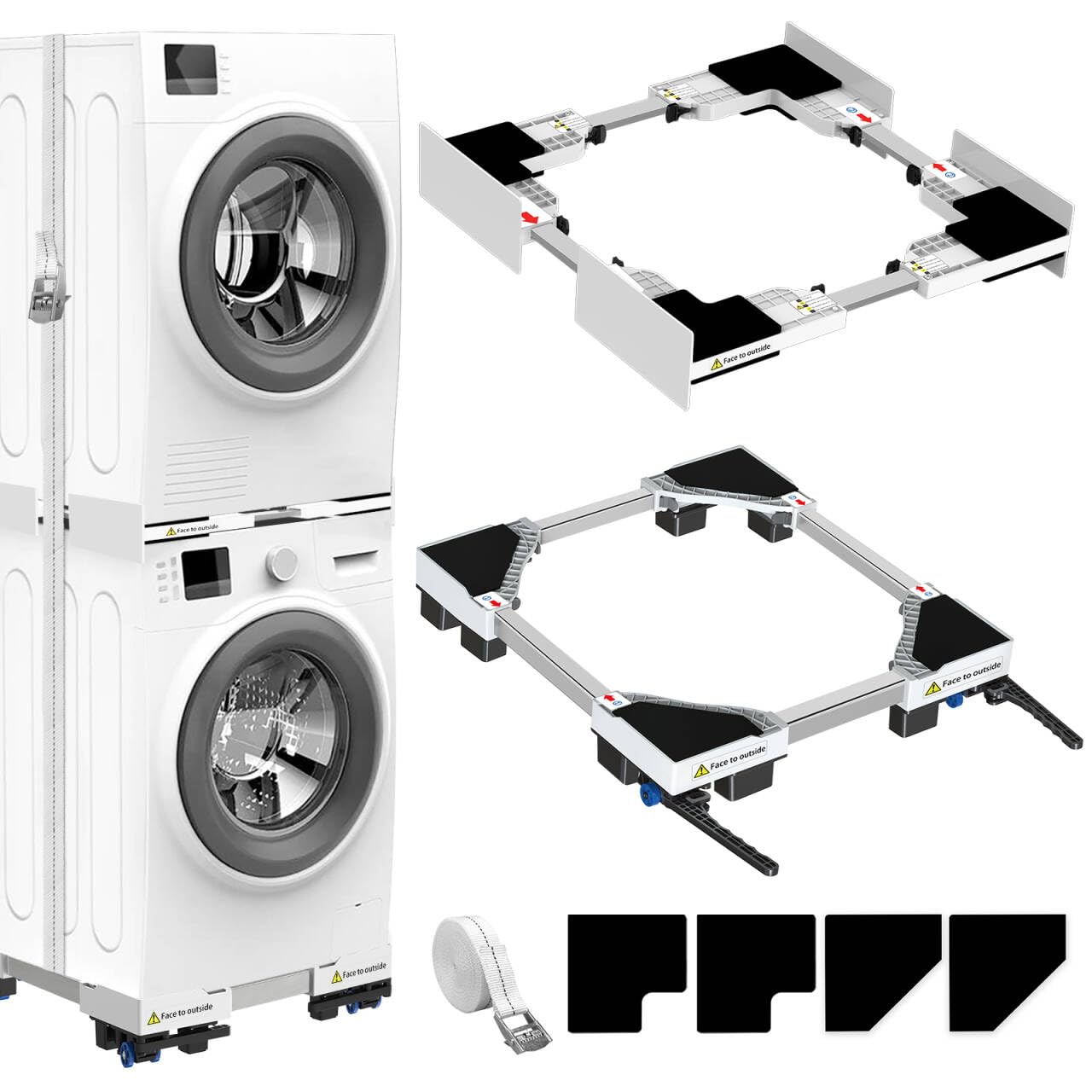 - Regolabilità e compatibilità: Le dimensioni del kit di impilamento: 46-66 cm/18,11-25,98 pollici, e le dimensioni della base per lavatrice: 42-69 cm/16,53-27,16 pollici. Dimensioni flessibili per adattarsi a un'ampia gamma di marche di lavatrici e asciugatrici.
