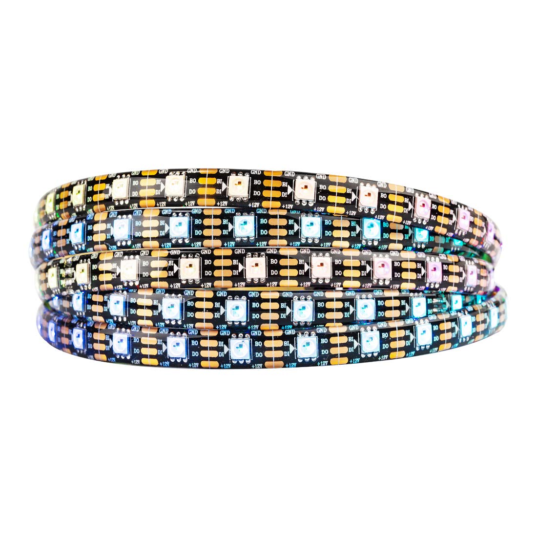 - La striscia è indirizzabile individualmente a DC12V, rappresentando un aggiornamento del WS2812 con dati di backup. Offre la massima luminosità del bianco senza cadute di tensione, 256 livelli di grigio e un display a colori a 24 bit.