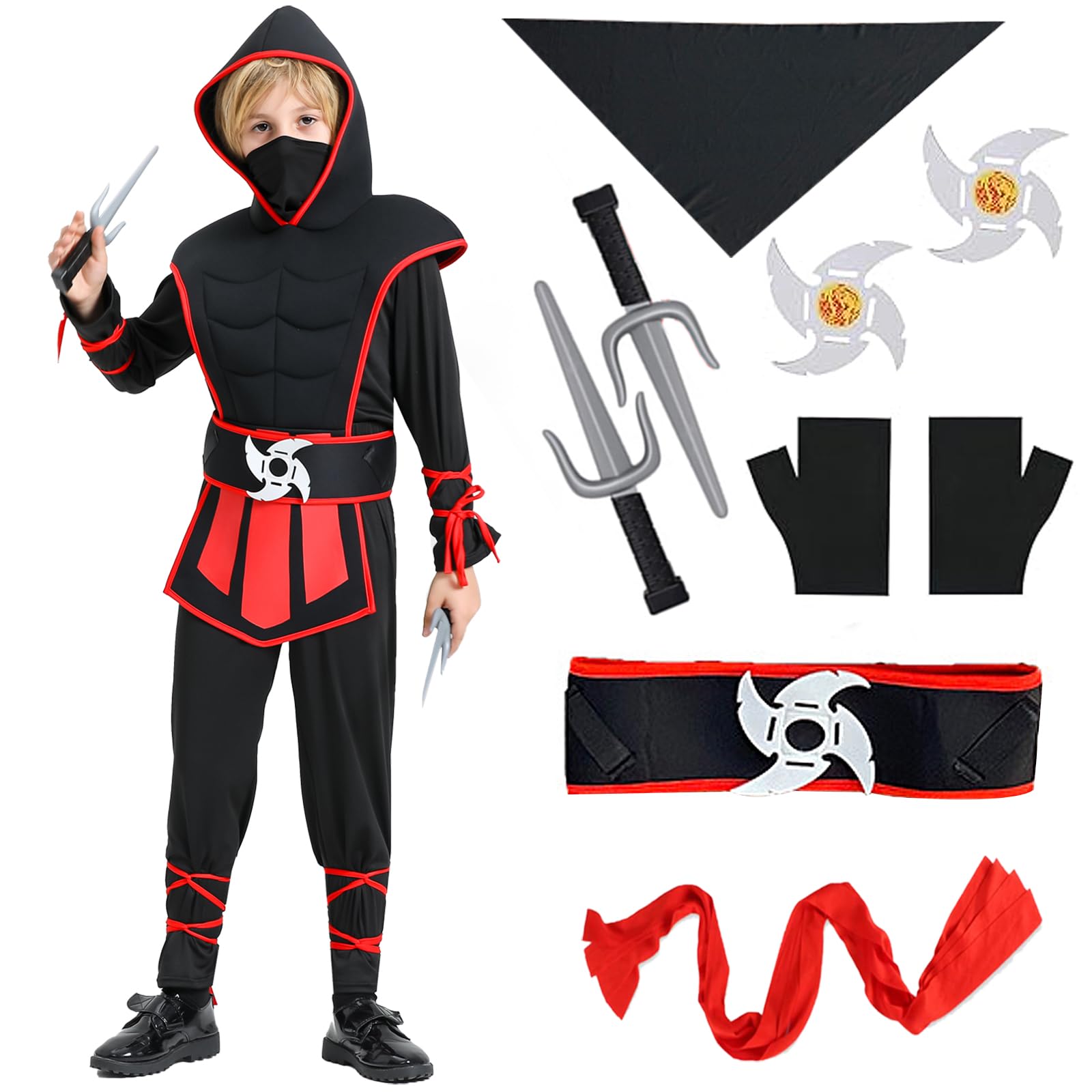 - Questo set di costumi Ninja per bambini include tutti gli accessori necessari per un'esperienza di gioco di ruolo completa, ideale per Carnevale, Halloween o feste a tema.