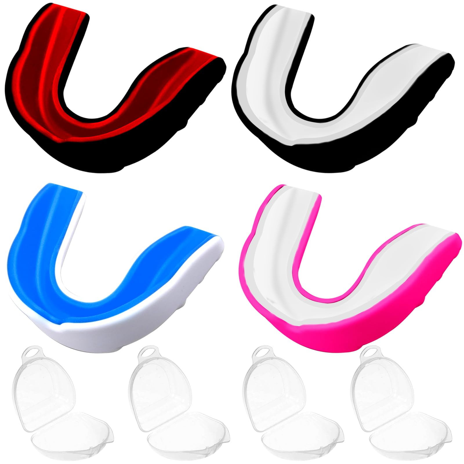 - La confezione include 4 paradenti sportivi slim fit per adulti e bambini, disponibili in quattro diverse combinazioni di colore (nero/bianco, blu/bianco, rosa/bianco, nero/rosso), ciascuno fornito con la propria custodia.