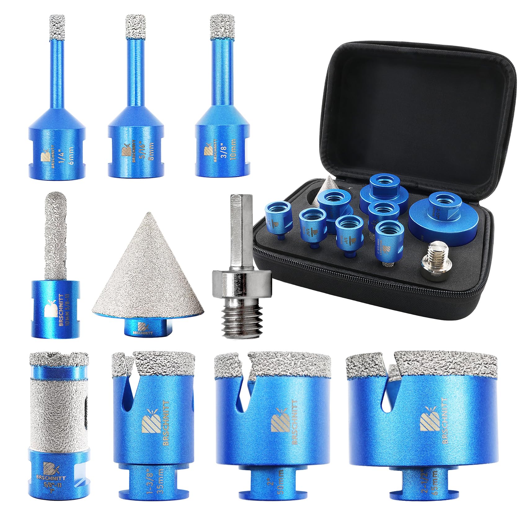 - Il set include 10 punte diamantate con diametri di 6/6/8/10/25/35/50/68 mm, caratterizzate da un'altezza del diamante di 10 mm e una lunghezza totale di 60 mm, con filettatura M14 per il trapano da piastrelle.