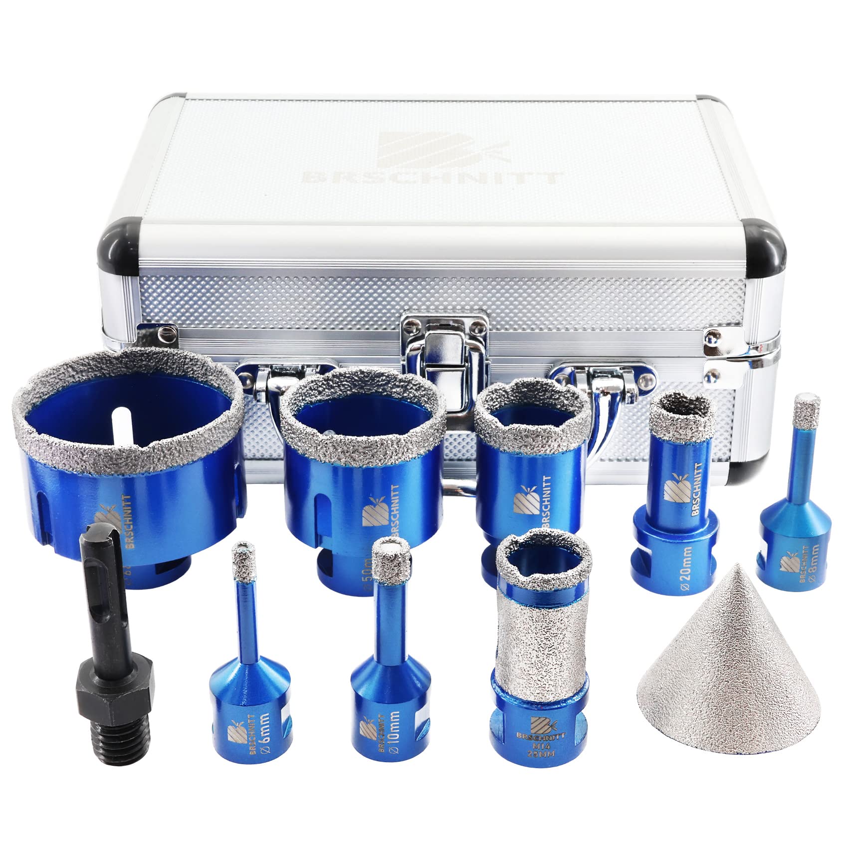 - Il set include punte diamantate nelle dimensioni 6/8/10/20/35/50/68 mm, con un'altezza del diamante di 10 mm e una lunghezza totale di 60 mm, dotate di filettatura M14.