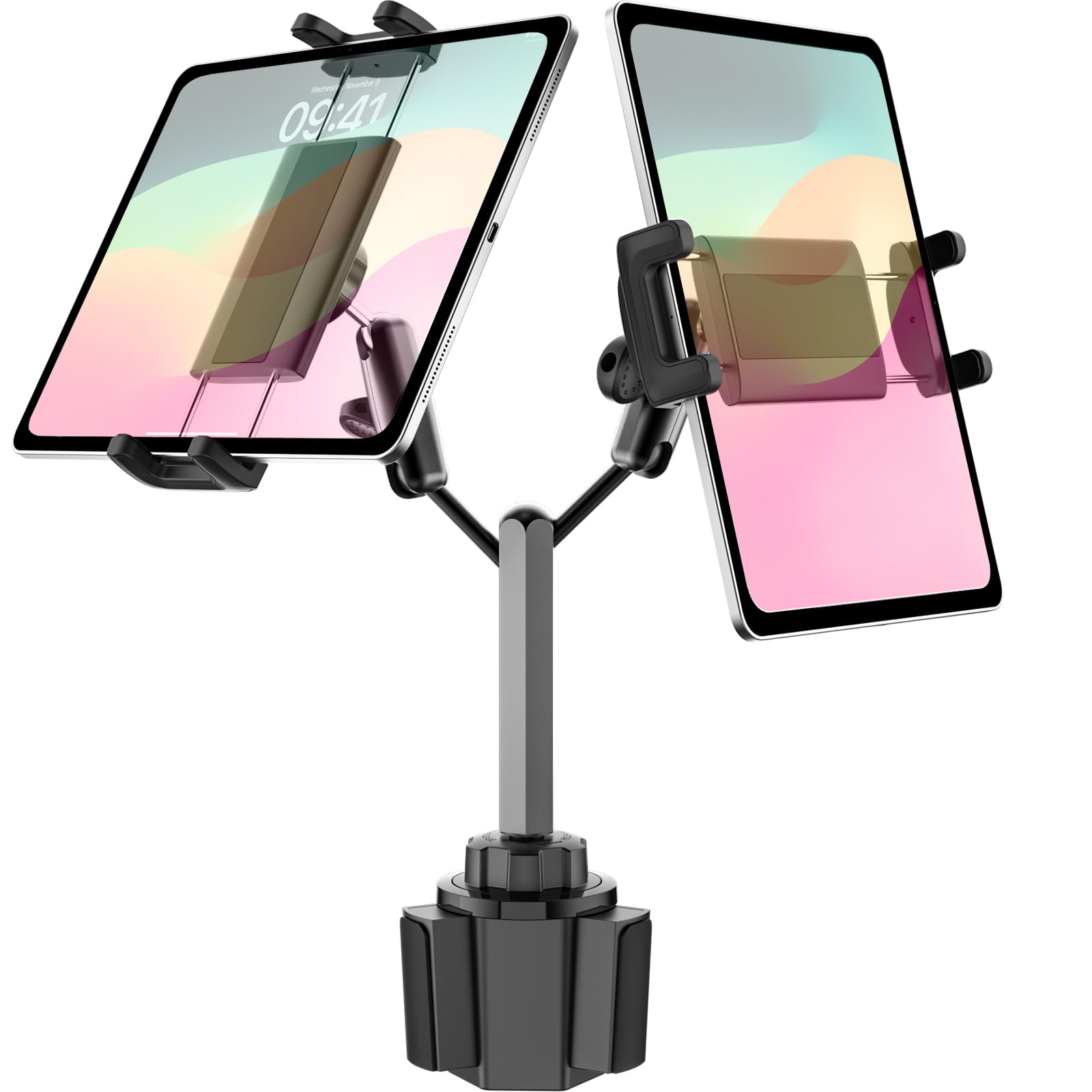 - Il supporto per tablet da portabicchieri è dotato di tre doppi bracci regolabili a 360° con testa a sfera, consentendo una rotazione completa per trovare l'angolazione ottimale sia per il conducente (navigazione) che per il passeggero (intrattenimento).