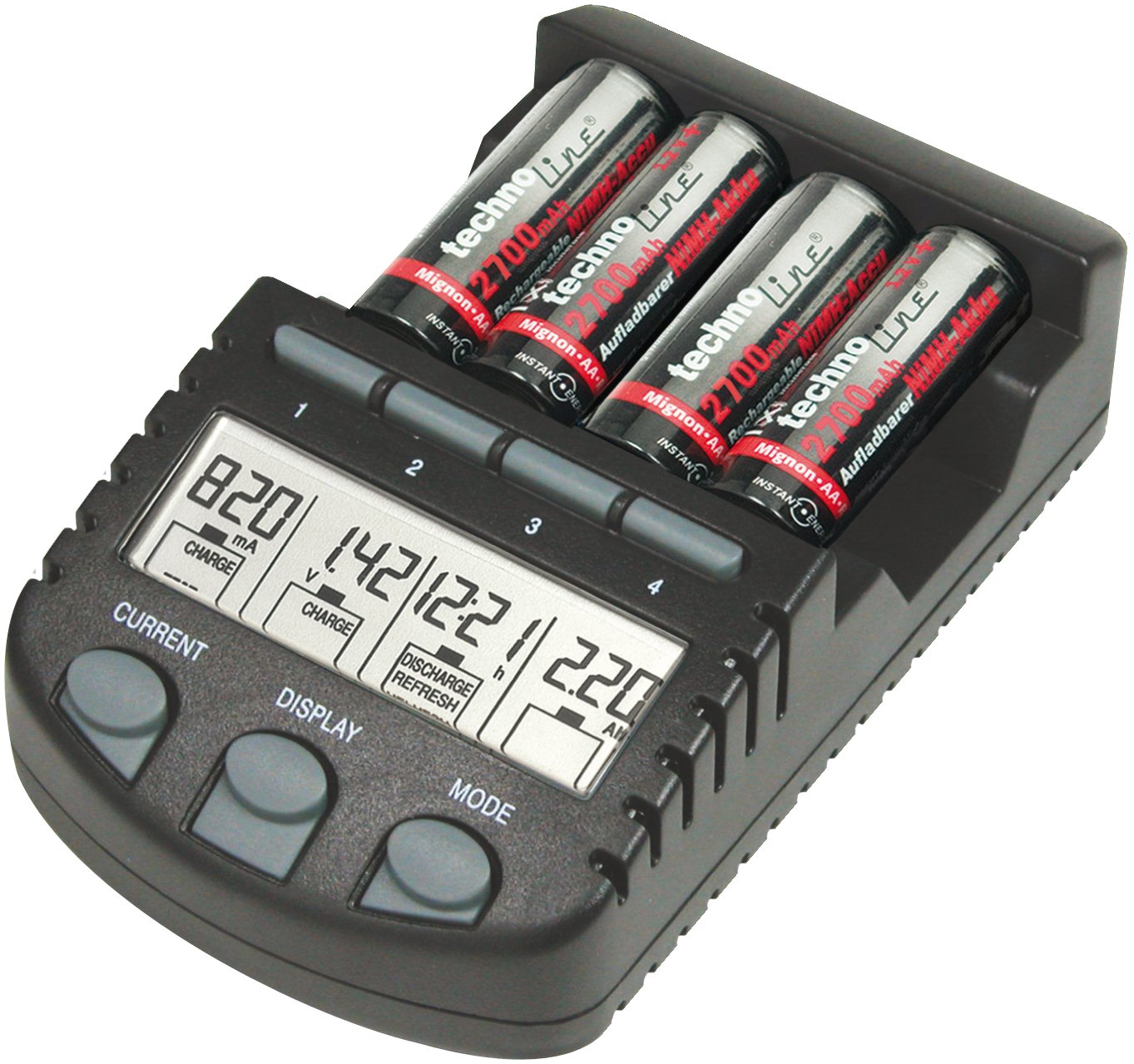 - Caricatore universale per batterie ricaricabili LR06 e LR03 Ni-MH (Nickel Metal-Hybrid - Ni-MH) o Nicad (Cadmium-Nickel - NiCd), da 200 mAh fino a 3000 mAh (milliampere ore).