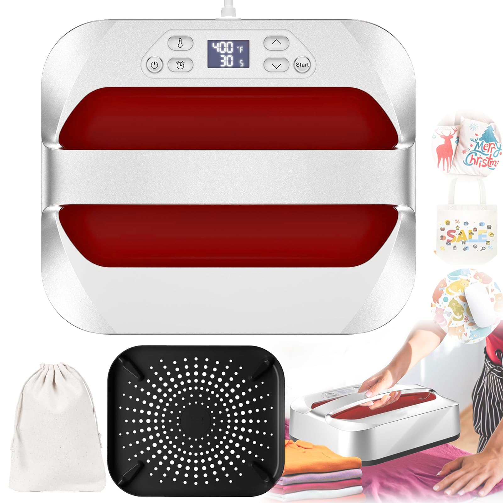 - 【Utilizzo Sicuro e Spegnimento Automatico】: La termopressa per magliette ha una base di sicurezza isolata su cui puoi posizionarla, rendendola più sicura da usare intorno ai tuoi bambini e animali domestici. Le maniglie superiori assicurano che le mani siano tenute lontane dalla piastra riscaldante. E la termopressa si spegnerà automaticamente se non la usi dopo 10 minuti. Con standard CE e ROHS e cavo di alimentazione approvato UL. Voltaggio: 220 V, potenza: 1200 W.