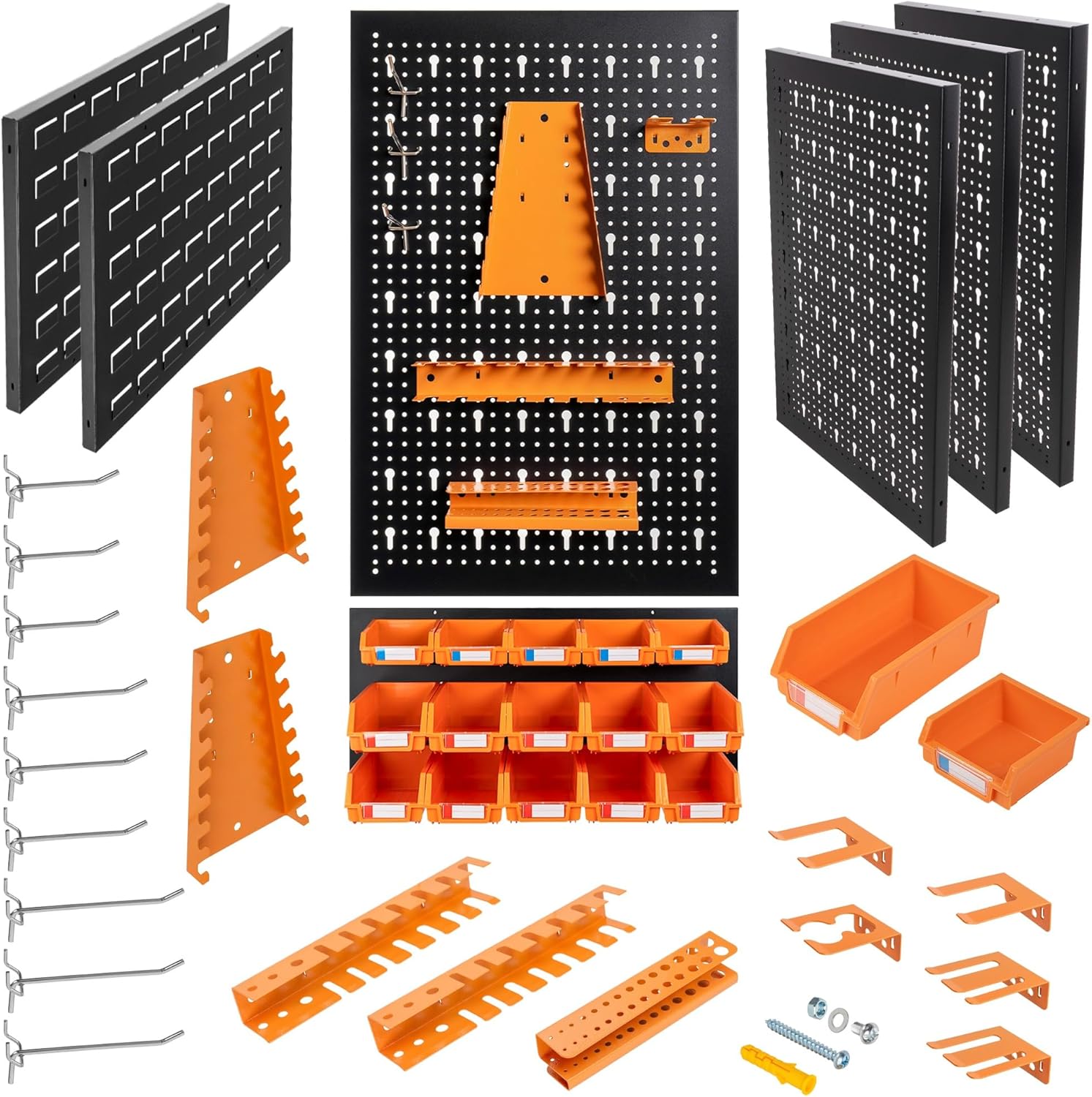- Il kit include 3 pannelli metallici da 40x60x2cm, 2 pannelli metallici da 30x60x2cm, 30 scatole per l'ordinamento (20 da 19x10x7cm e 10 da 11x10x5cm), oltre a ganci e supporti di alta qualità per una sistemazione ottimale degli attrezzi.