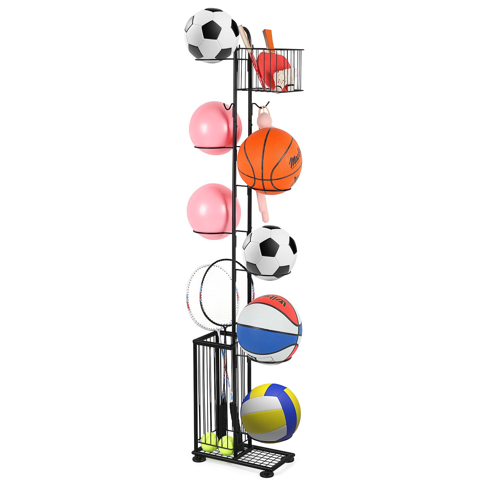 - Questo rastrelliera per palloni da basket multifunzionale include due cestini: uno per palline da tennis, badminton o rugby e oggetti come ginocchiere, e un livello inferiore per mazze da baseball, racchette da softball, tennis, badminton, pickleball e altre attrezzature sportive.