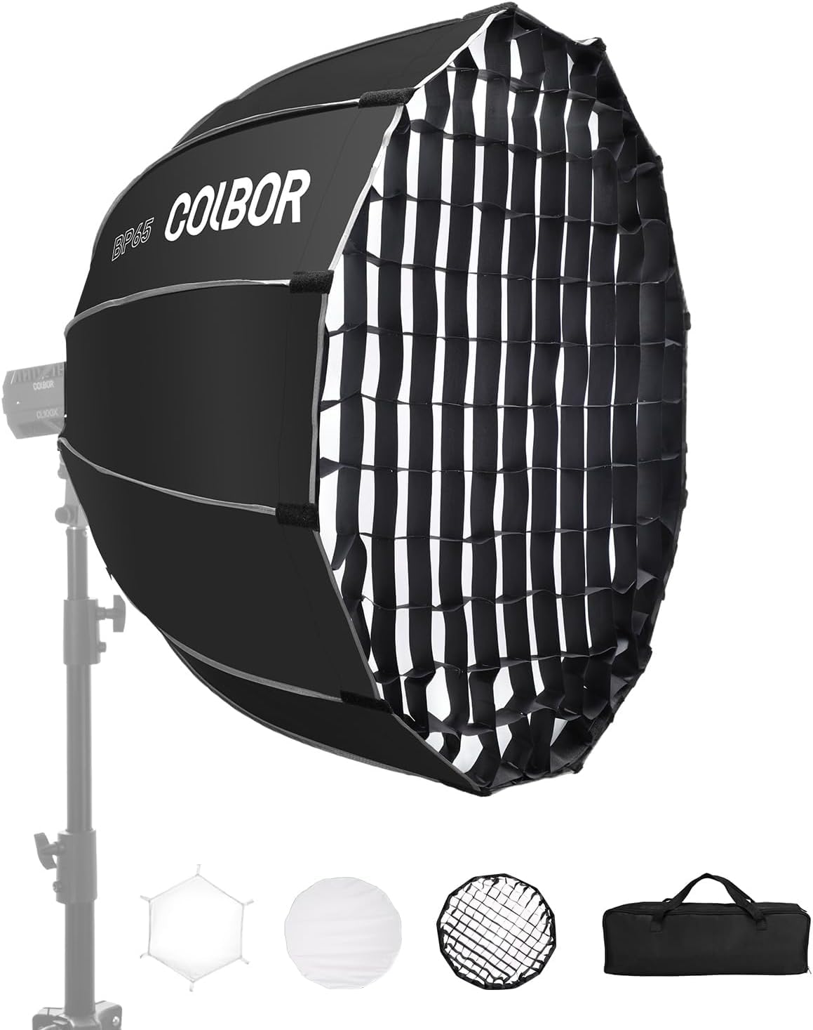 Sgancio rapido · 16 nervature · Doppio diffusore · Griglia a nido d'ape · Compatibile COLBOR CL60/CL100X/CL100 e luci Bowens Mount