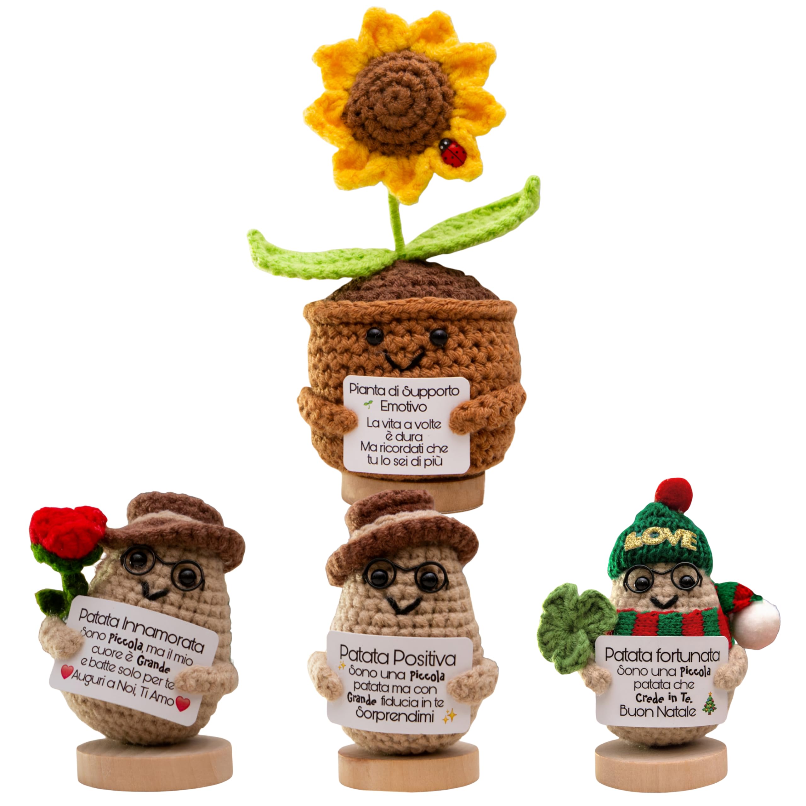 - Il Girasole Positivo TerraDesign è un amigurumi artigianale, realizzato all'uncinetto con filato di lana di alta qualità, misurando circa 17 × 7 cm. Presenta un dolce sorriso, una coccinella portafortuna e un supporto stabile in legno. Questo fiore motivazionale e simbolico è perfetto per illuminare qualsiasi spazio, come decorazione per scrivania, cameretta, salotto, soggiorno, studio o ufficio, incarnando l'artigianato italiano e trasmettendo serenità, armonia e luce.