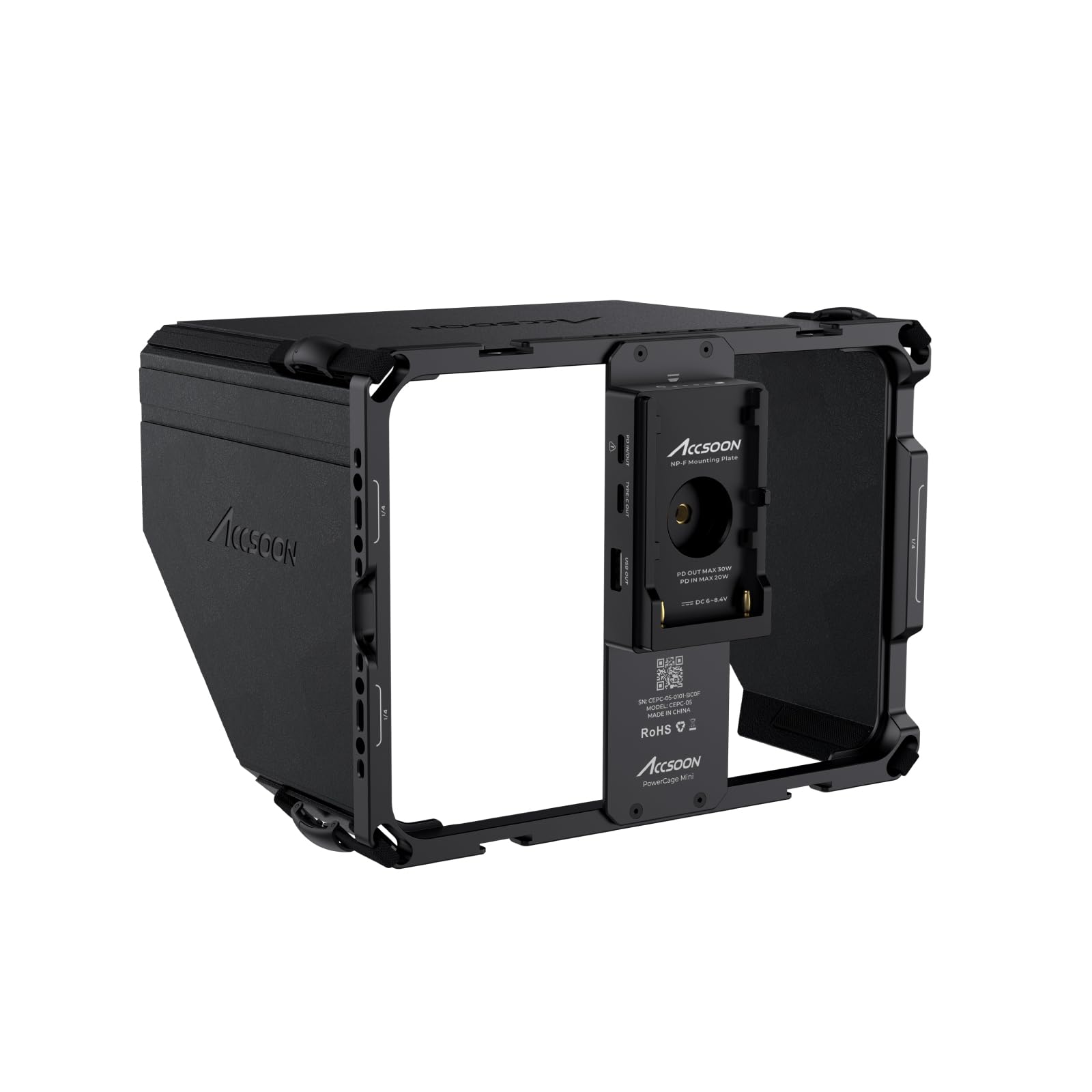 - L'adattatore rimovibile per batteria Accsoon NPF, compatibile con batterie di tipo NP-F, si fissa facilmente al PowerCage Mini tramite un attacco a vite da 1/4″-20, fornendo alimentazione continua al tuo dispositivo.