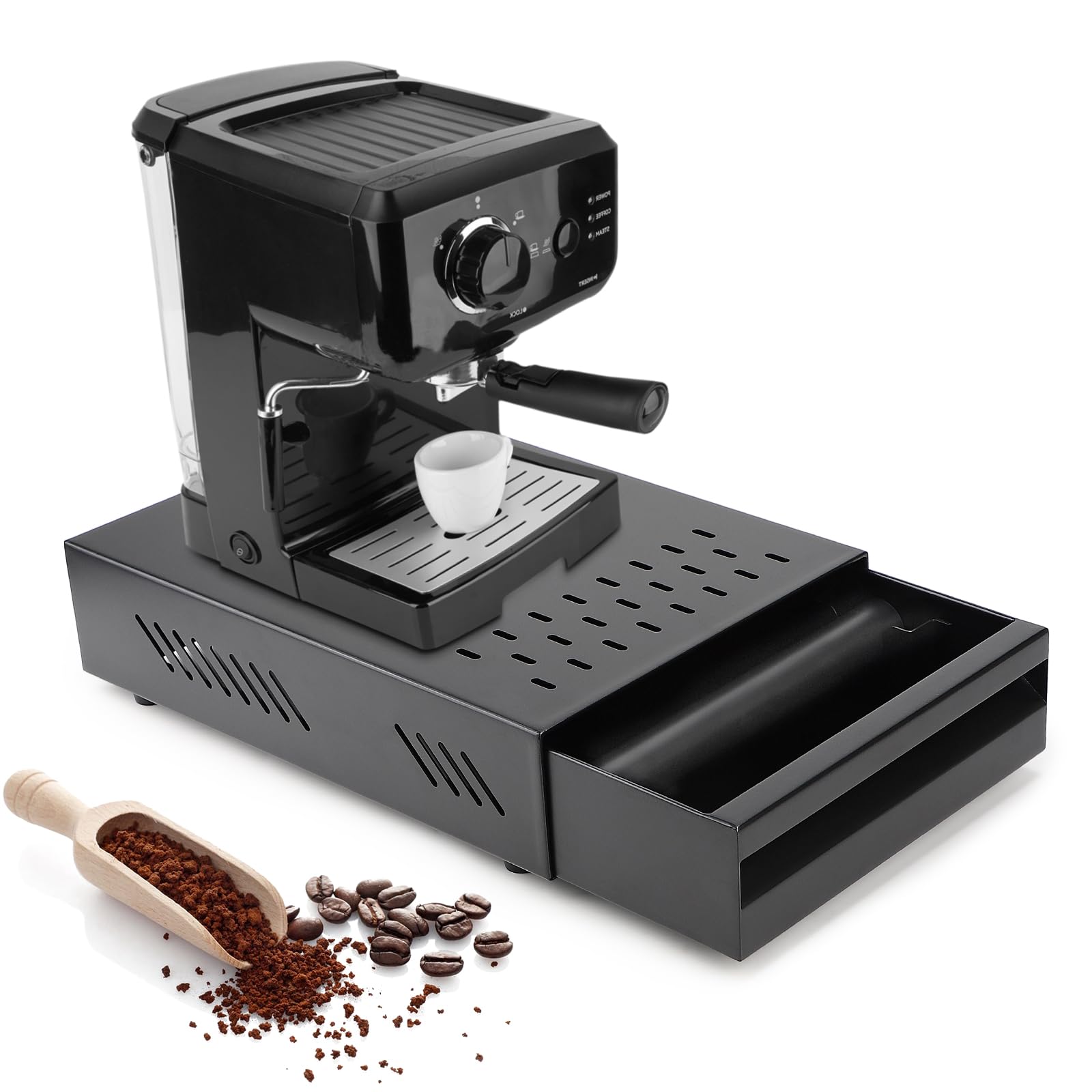 - Realizzato in metallo di alta qualità con piastre rinforzate, il cassetto per fondi di caffè offre un'elevata capacità di carico e non presenta spigoli vivi. La base in gomma antiscivolo assicura stabilità, prevenendo scivolamenti o oscillazioni durante l'uso.