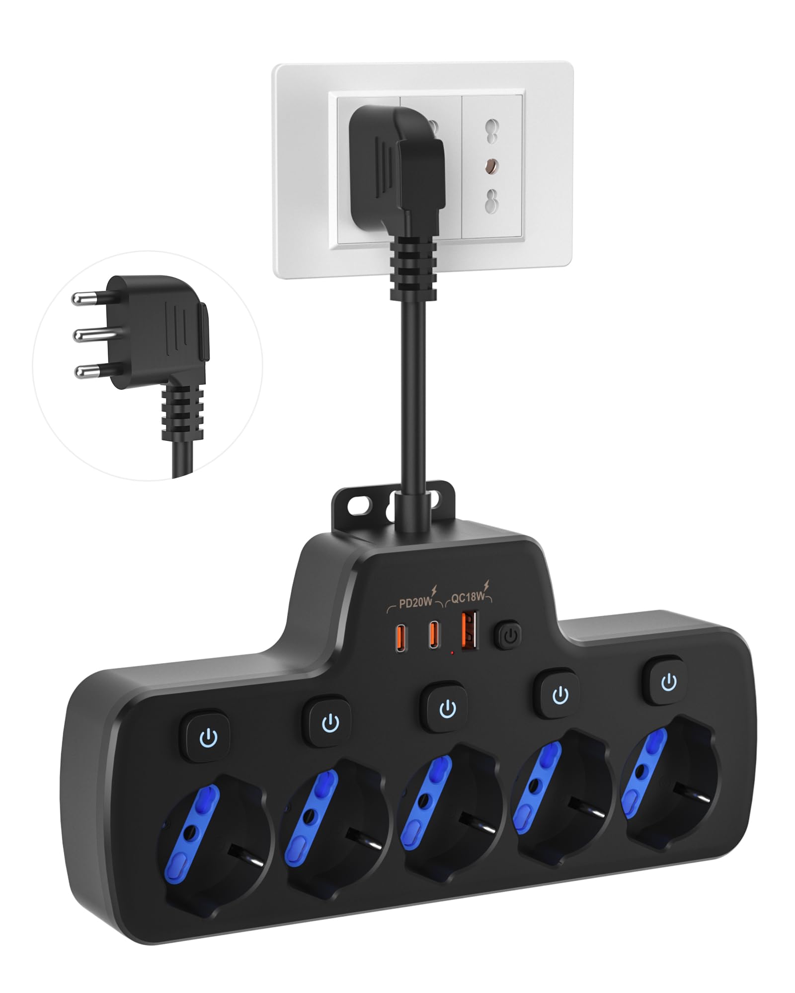 - Multipresa 5 prese: la ciabatta elettrica multipresa è dotata di 5 posti Polivalenti Schuko Bipasso 10 A/16 A, disposte in una presa ad angolo di 45 gradi e supporta spine italiane grandi/piccole a 3 poli di tipo L, nonché spine universali tedesche ed europee (tipo E, F, C), adatte ad elettrodomestici con vari tipi di spine come forni, forni a microonde, macchine per il caffè, ecc