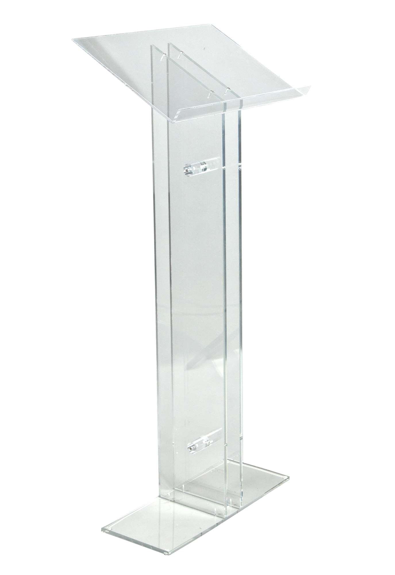 - Leggio in acrilico trasparente, utilizzabile anche come podio o scrivania per documenti. La sua struttura include una base a "T" con due piedi in acrilico, una superficie per i documenti e due elementi di fissaggio, tutti uniti da viti. Dotato di quattro paraurti antiscivolo.