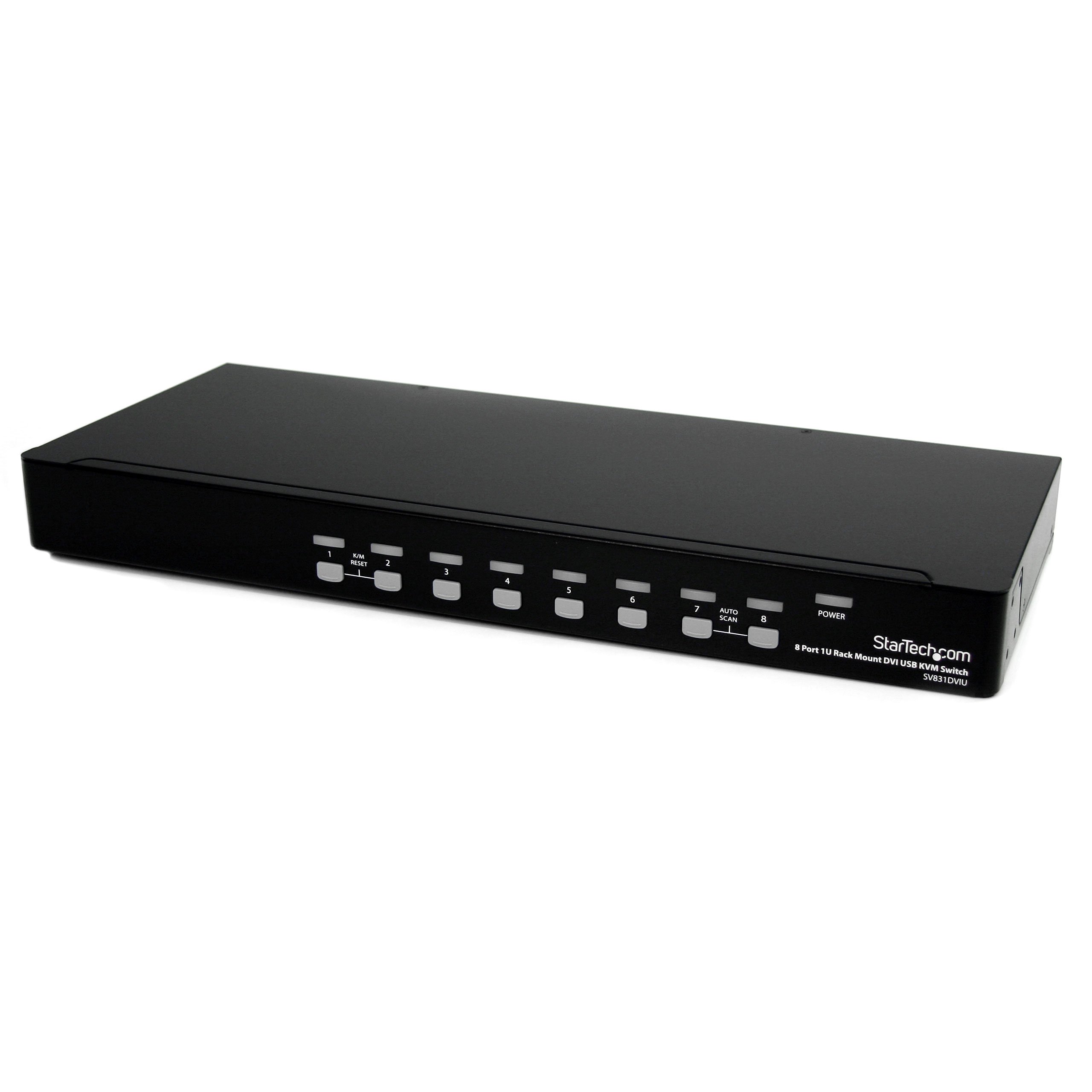 - Questo switch KVM DVI USB a 8 porte, con un fattore di forma 1U per montaggio a rack, consente di gestire fino a 8 computer dotati di uscita display DVI o HDMI tramite un'unica tastiera, mouse e monitor.
