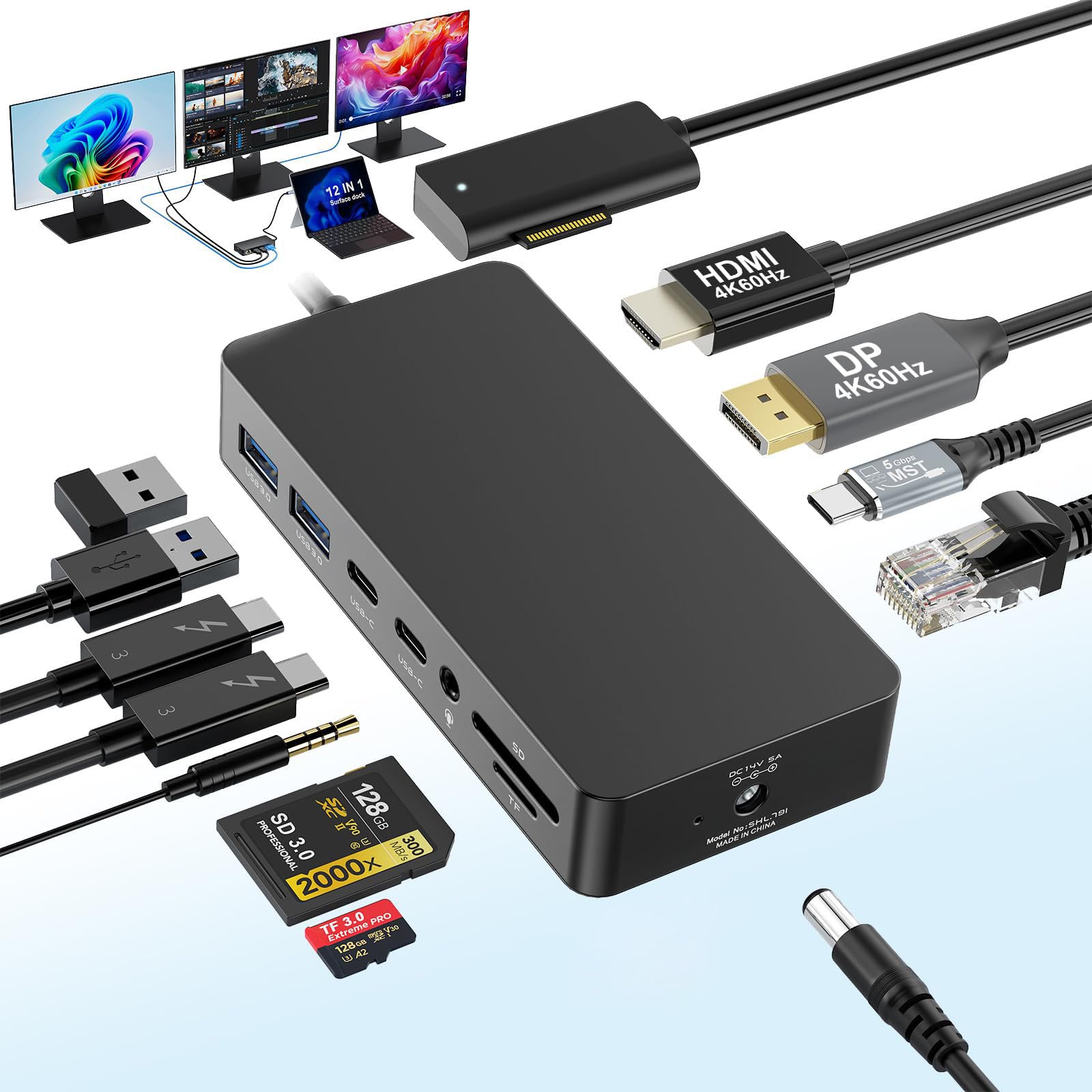 - Lista compatibile con Surface Dock: la docking station Surface Pro compatibile con Surface Pro 11/10/9/8/X/7/6/5/4/2017, Surface Laptop 7/6/5/4/3/2/1, Surface Laptop Go 3/2/1, Surface Laptop Studio 2/1, Surface Book 3/2/1 (Nota: si prega di collegare la superficie magnetica. In the right. direction to your surface and connect the power supply port when using)