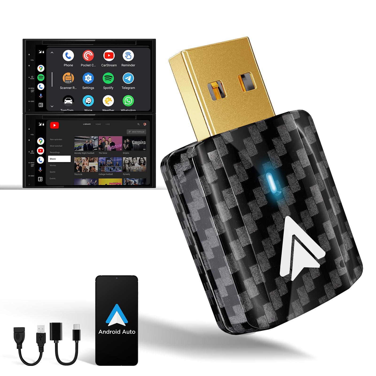 - ✅Connessione semplice in 3 passaggi – 1. Inserisci l’adattatore nella porta USB della tua auto. 2. Accoppialo tramite Bluetooth con il tuo telefono. 3. Conferma la connessione e avvia Android Auto Wireless.