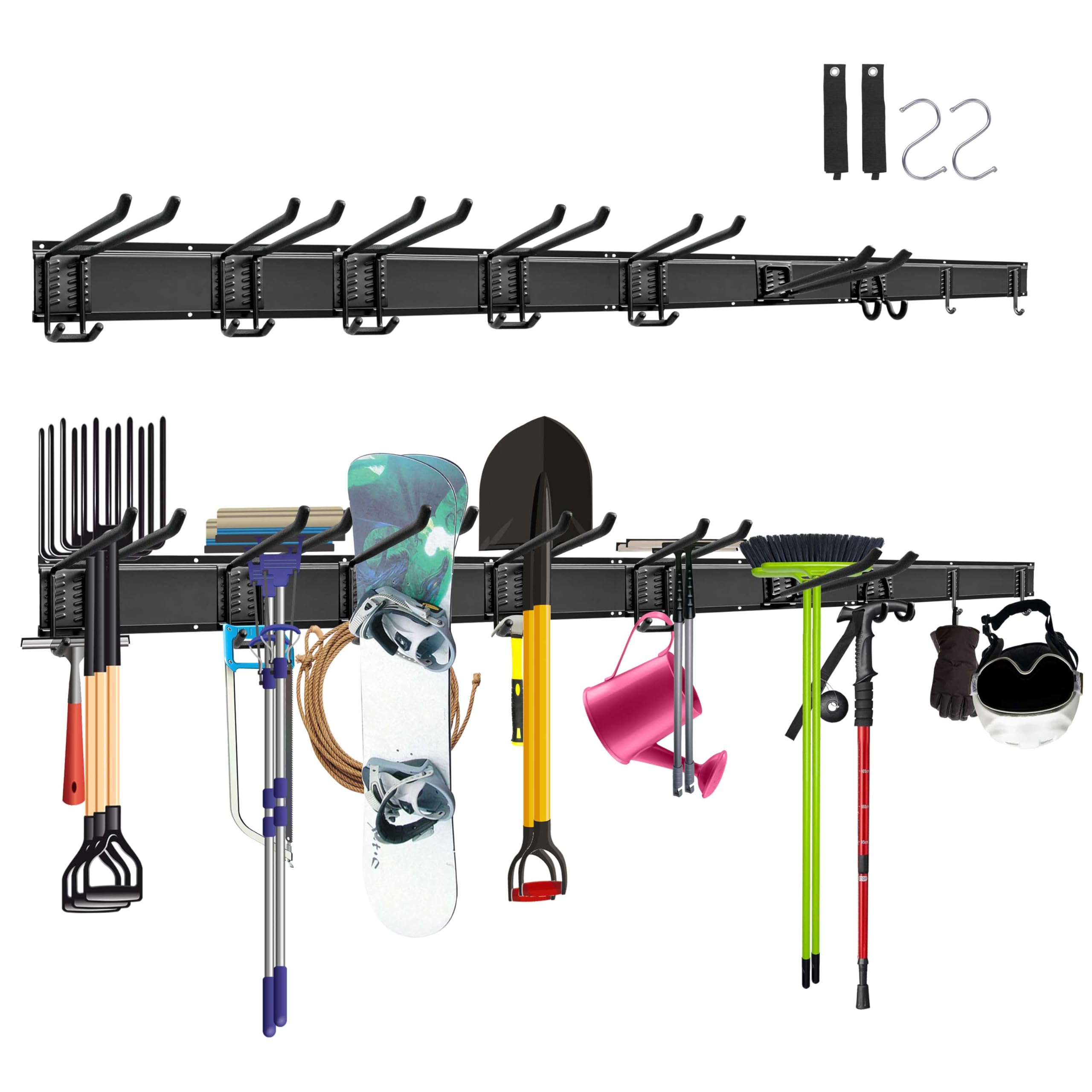- Portautensili con 4 binari (162 cm di lunghezza totale), 9 ganci, 2 ganci semicircolari e 2 cinghie robuste per riporre vari attrezzi da giardino.