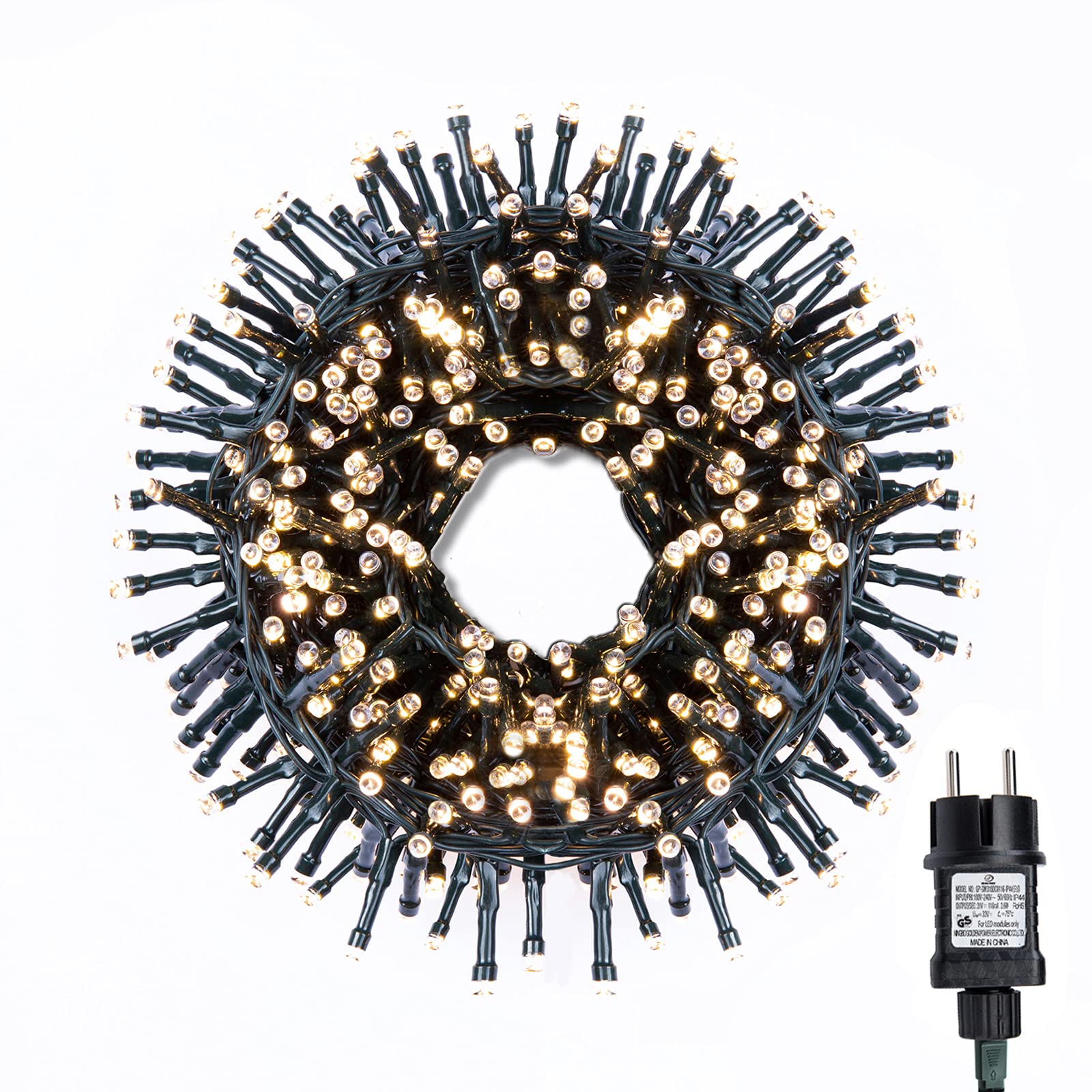 - Questa catena luminosa è composta da 1000 lampadine LED distribuite su un cavo verde scuro di 20 metri, con un cavo di alimentazione aggiuntivo di 5 metri.