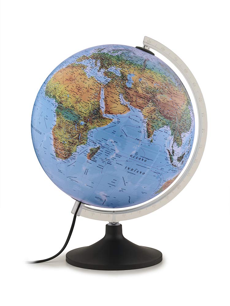 - Il design classico del mappamondo è completato da un meridiano graduato per la localizzazione della latitudine. La base in plastica rinforzata assicura stabilità, e la sfera ruota liberamente sul proprio asse. Il mappamondo ha un diametro di 30 cm e un'altezza di 40 cm. Viene fornito in una scatola neutra e sostenibile.