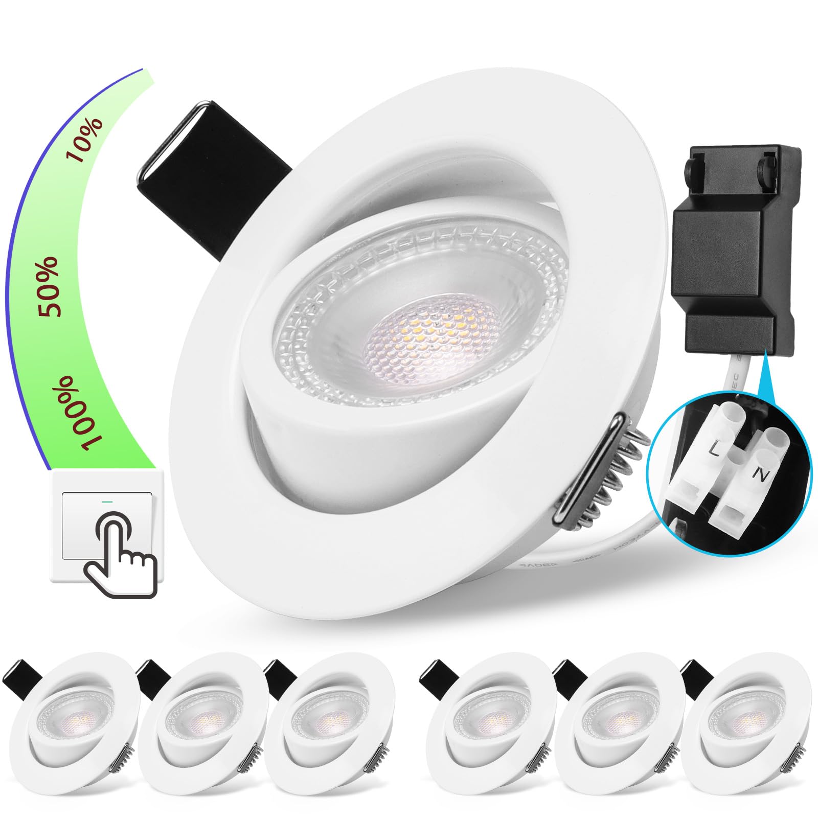 - 【3 livelli di intensità regolabile】Il faretto a LED non richiede un interruttore dimmer, è possibile regolare facilmente la luminosità con un normale interruttore della luce. Il faretto a LED è disponibile in tre diversi livelli di luminosità (100%-500lm, 50%-300lm, 10%-90lm). Scegli una luminosità confortevole in base alle tue esigenze, crea uno spazio senza sfarfallio e silenzioso nella tua stanza. Non necessita di dimmer esterno, non sono necessari componenti aggiuntivi