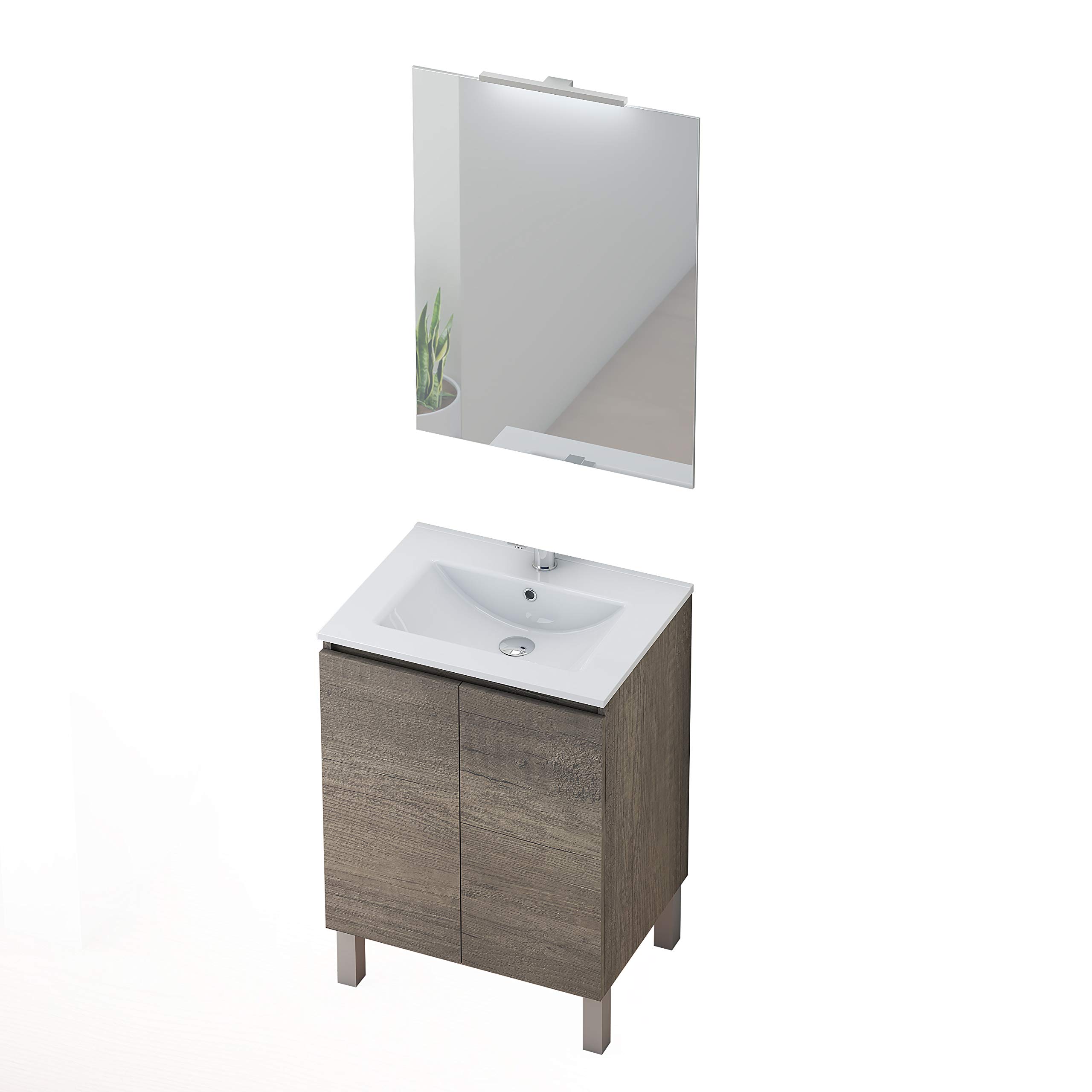 - Mobile fabbricato a Barcellona, in Spagna, set di mobili da bagno con lavabo e specchio applique a LED, in uno stile contemporaneo ed elegante. La sua finitura in Nebraska, lo rende abbinabile a qualsiasi tipo di bagno. Composto da un mobile con gambe, che comprende due ante e uno specchio con applique LED.