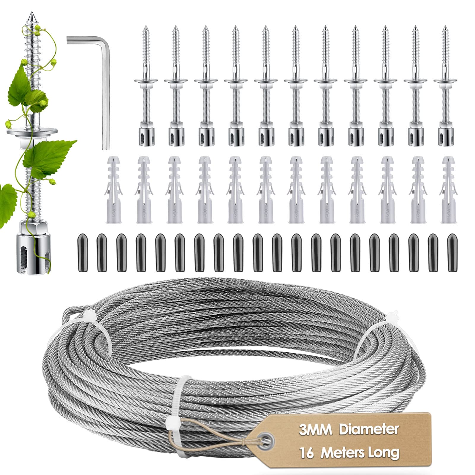 - Questo kit per piante rampicanti è realizzato in acciaio inossidabile di alta qualità (3 mm, resistenza alla trazione: 1570 N/mm²), garantendo robustezza, durabilità e resistenza alla corrosione, oltre a un'elevata capacità di carico.