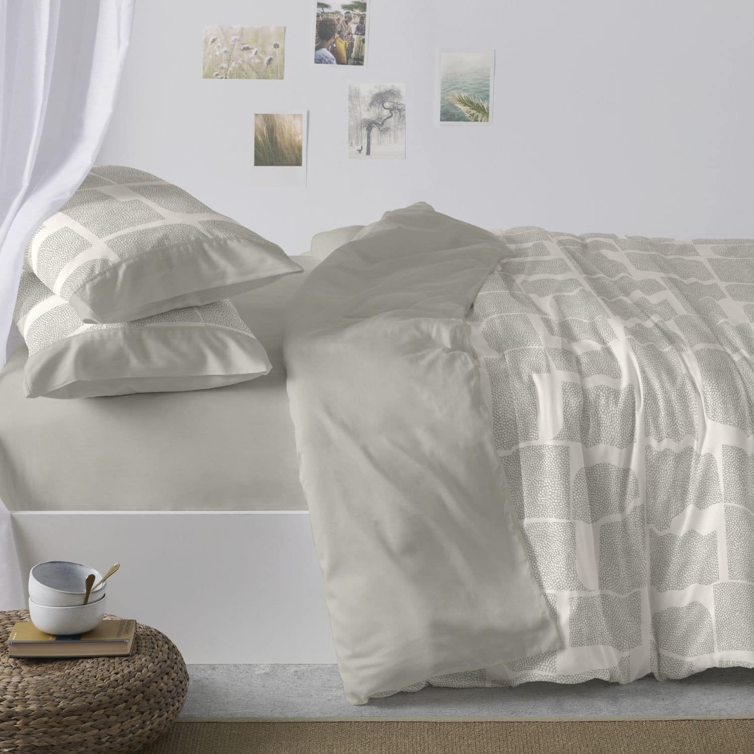 - Il set copripiumino presenta una stampa geometrica in stile etnico, con forme color alloro e piccoli punti irregolari beige su un fondo beige. Il retro è in colore alloro. Le federe riprendono lo stesso design con un'applicazione in alloro, mentre il lenzuolo con angoli è in colore alloro.
