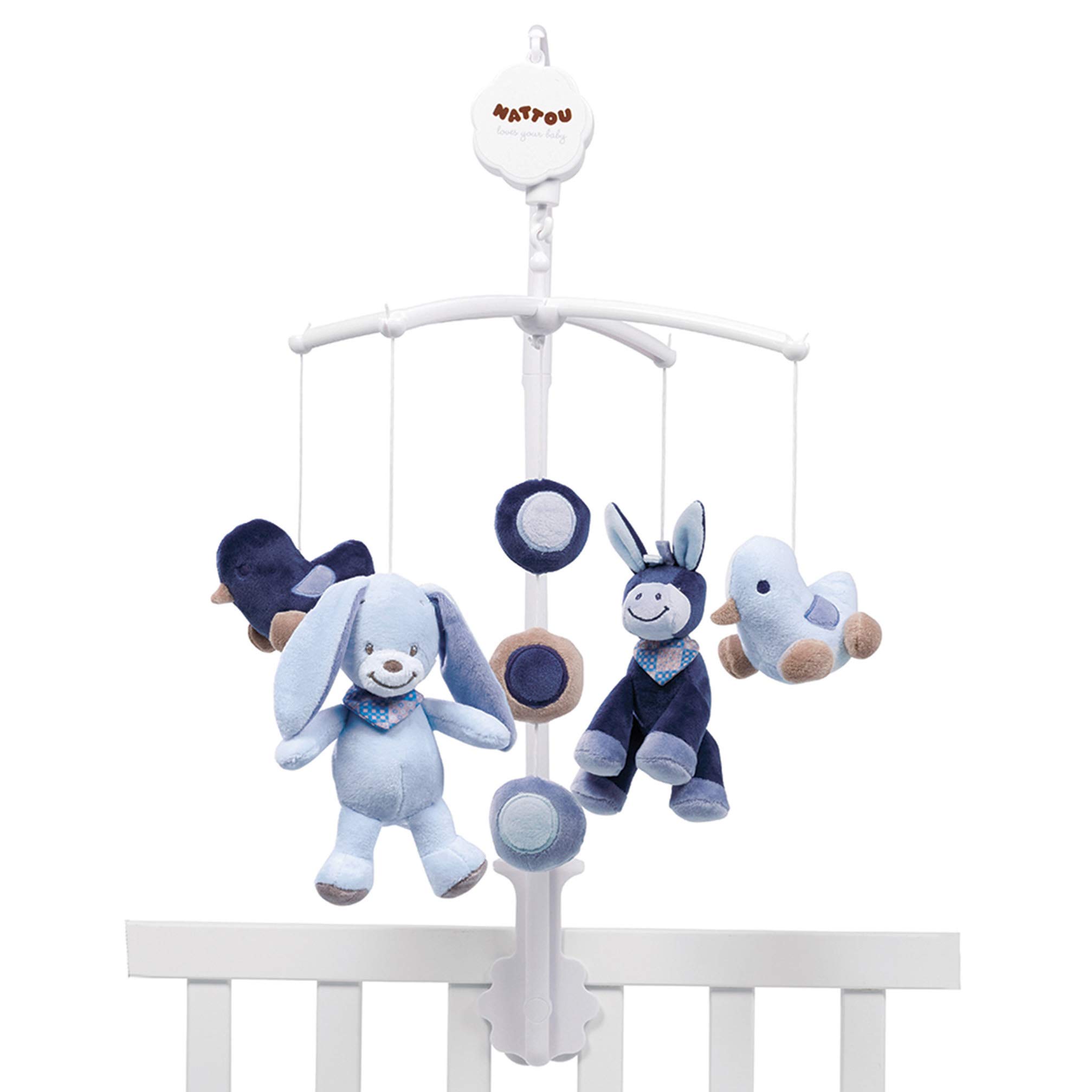 - La confezione include una giostrina musicale Nattou con pupazzetti della collezione Alex e Bibou, realizzata in 100% poliestere, con dimensioni di 37 x 31 x 9 cm e colore blu.