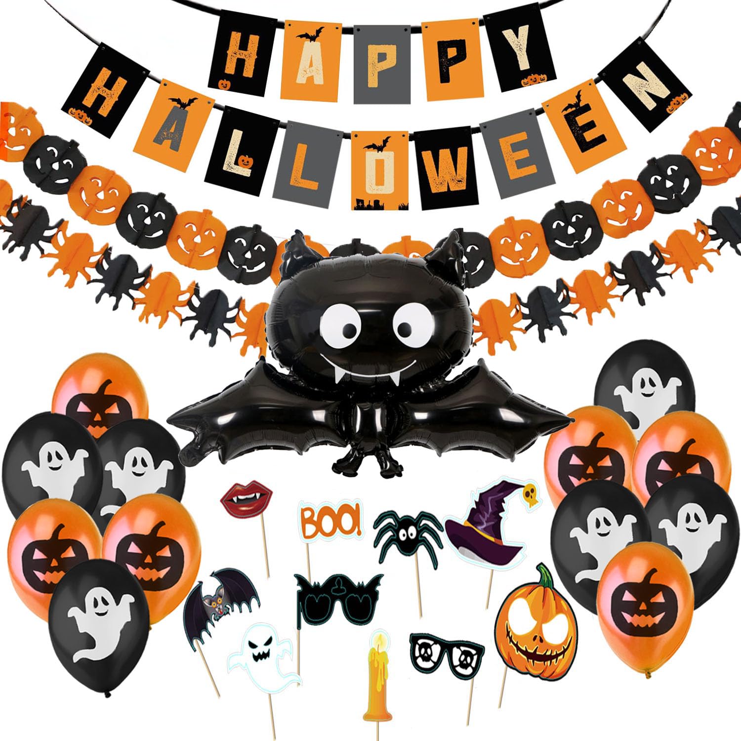 - 🎃 KIT COMPLETO PER HALLOWEEN 🎃 Ci sono un totale di 26 pezzi tra cui un banner Happy Halloween, 2 ghirlande con zucche e ragni, 6 palloncini neri e 6 arancioni con il disegno stampato di zucche e fantasmi, 1 enorme palloncino a pipistrello e 10 accessori fotografici a tema.