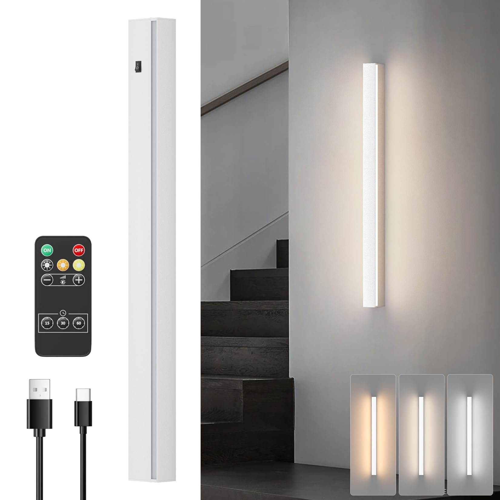 - 【Applique da parete Dimmerabile】 L'lampada da parete senza fili è dotata di un telecomando, è possibile commutare la temperatura del colore da 3000K/4500K/6000K con il telecomando, e si può anche regolare la luminosità dal 10% al 100%. Il telecomando è dotato anche di funzione timer, per cui è possibile scegliere il tempo del timer in base alle proprie esigenze. Nota: la premessa del telecomando è che è necessario aprire manualmente la lampada a muro prima di poterla utilizzare.