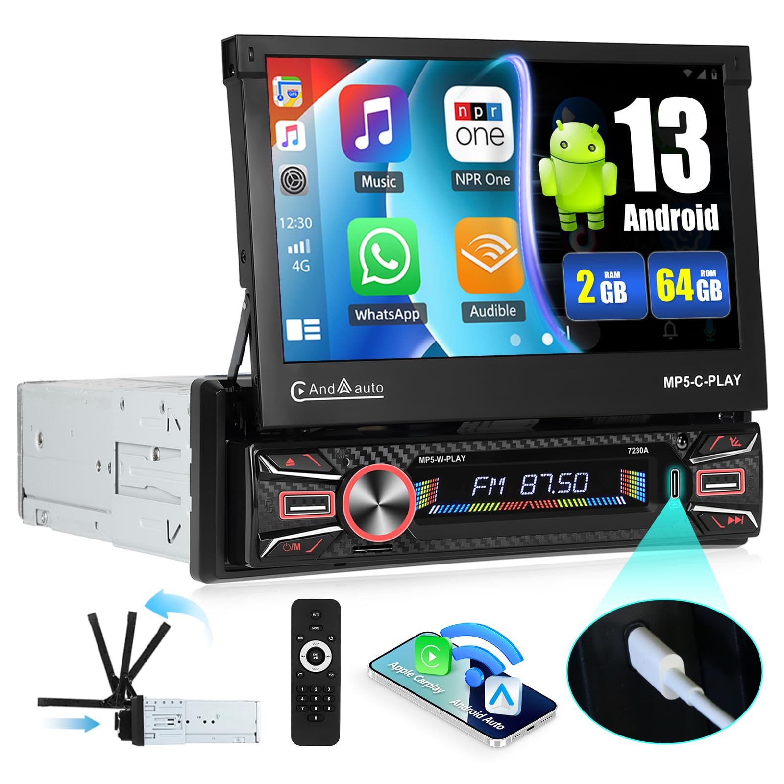 - 🚗【Autoradio 1 Din Android 13】Sistema operativo Android 13 standard per autoradio 1 Din, 2 GB di RAM assicurano un funzionamento regolare e una risposta più veloce. 64GB ROM supporta più applicazioni installate.7 pollici HD 1080P display Auto retrattile, può essere aperto e piegato in qualsiasi momento, si prega di notare che l'angolo dello schermo non è regolabile.Con telecamera di visione notturna impermeabile gratuita