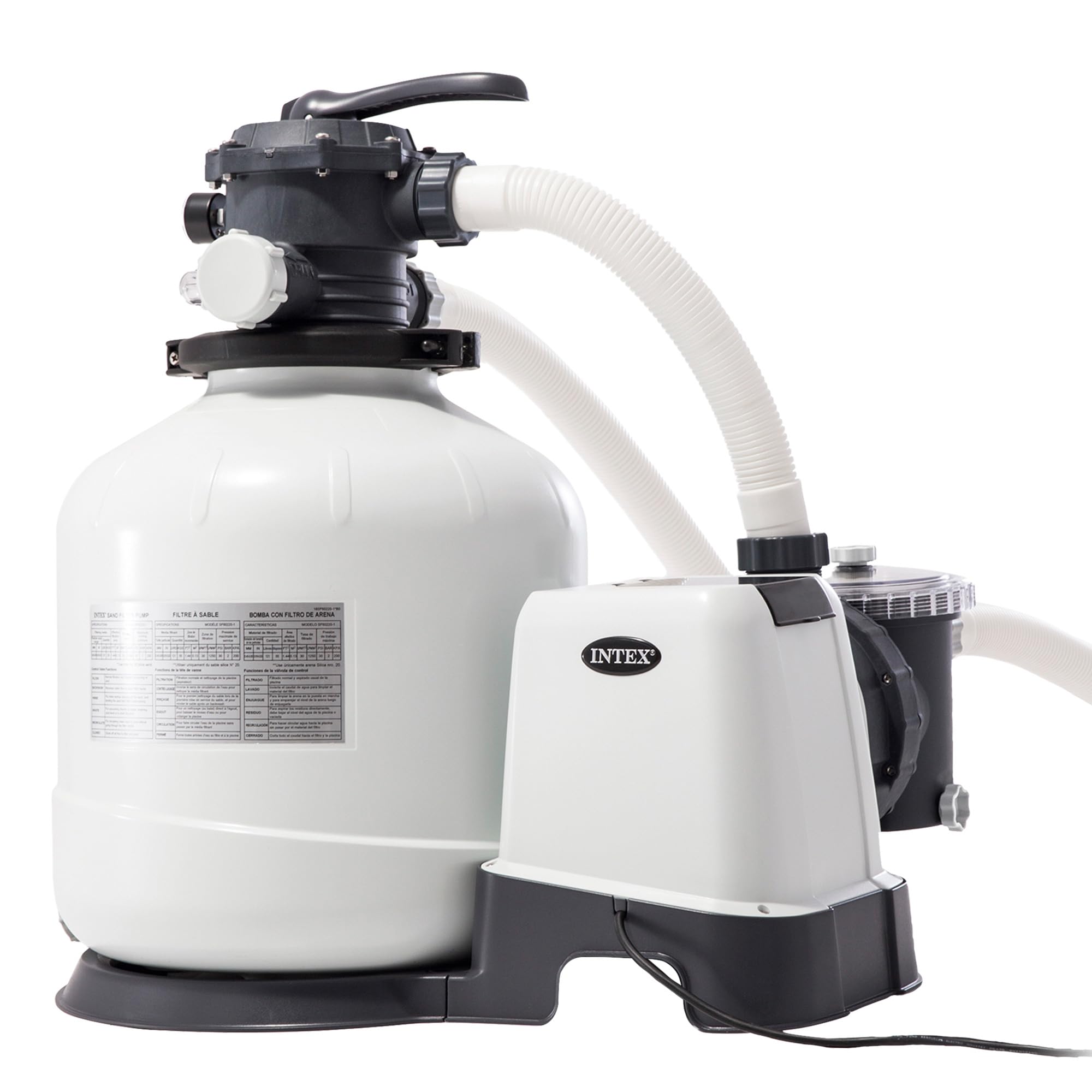 - La pompa è dotata di una valvola a 6 funzioni, un display con timer automatico integrato da 24 ore per la programmazione, una tanica per la sabbia, un potente motore da 220-240 V per una filtrazione efficace e un cestello filtro per una manutenzione semplificata.
