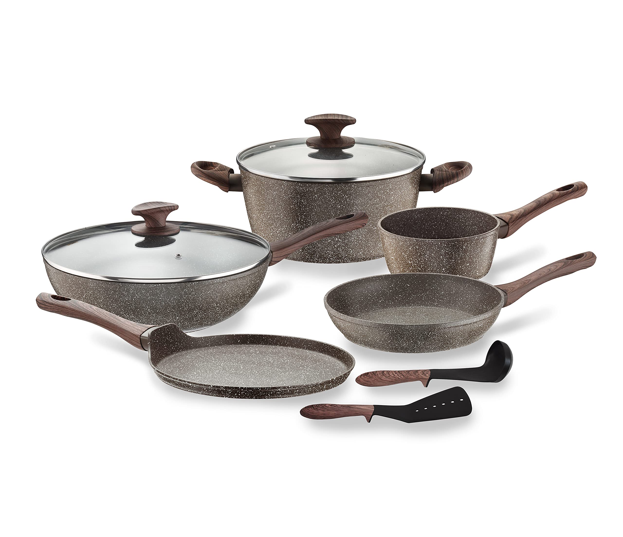 - RAFFINATO RIVESTIMENTO EFFETTO PIETRA CON PRATICO MANICO RESISTENTE AL CALORE: la linea Natura è caratterizzata dal bellissimo rivestimento antiaderente effetto pietra e da un manico effetto legno, realizzato con materiale SOFT TOUCH ANTISCIVOLO e ANTISCOTTATURA che non assorbe il calore dei fornelli e garantisce una presa ergonomica, consentendo di cucinare in maniera facile e sicura.