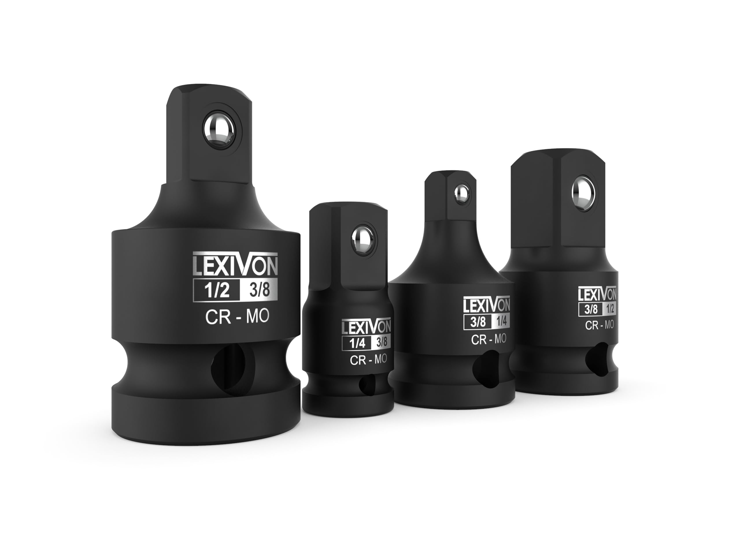 - Il set include quattro adattatori/riduttori: uno da 1/4" (F) a 3/8" (M), uno da 3/8" (F) a 1/4" (M), uno da 3/8" (F) a 1/2" (M) e uno da 1/2" (F) a 3/8" (M).