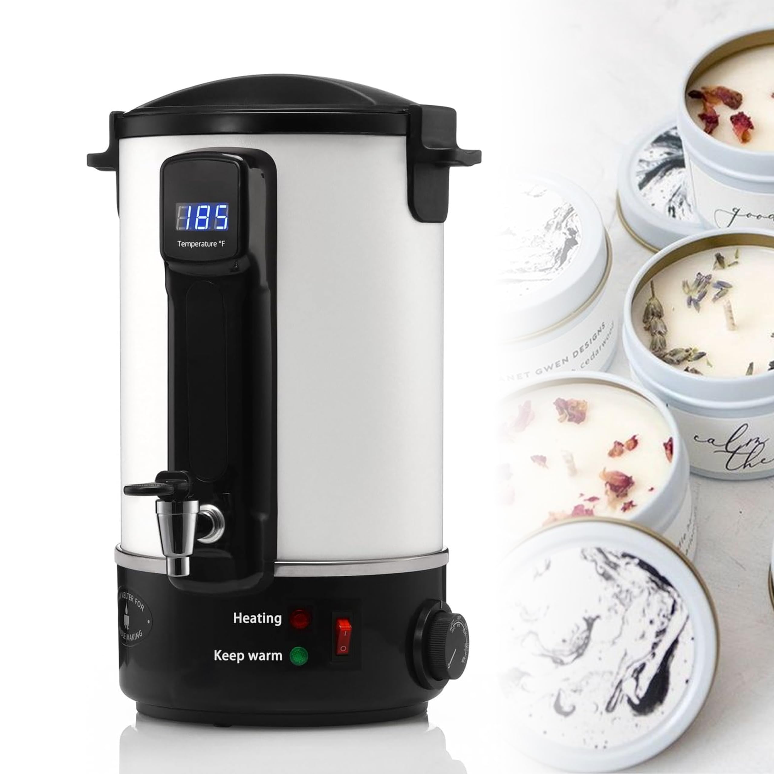 - Questo forno per la fusione della cera garantisce un riscaldamento rapido, migliorando l'efficienza produttiva e risparmiando tempo prezioso. Il beccuccio integrato facilita il versamento della cera fusa negli stampi, minimizzando il rischio di fuoriuscite e scottature, ed è progettato per la produzione di candele e saponi.