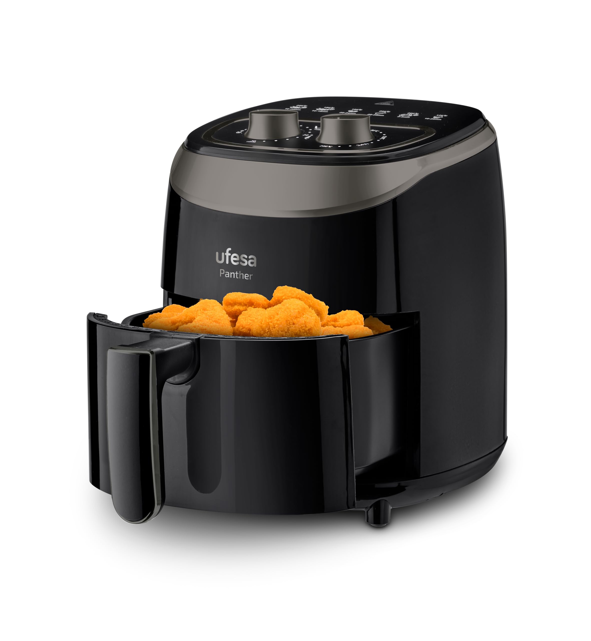 - Questa friggitrice ad aria Ufesa Panther da 1200 W utilizza la tecnologia di circolazione dell'aria ad alta velocità a 360°, permettendo di cucinare senza oli aggiunti per piatti più sani e meno calorici.