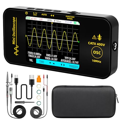 - L'oscilloscopio include una batteria ricaricabile integrata da 1200 mAh che garantisce oltre 8 ore di funzionamento continuo. La confezione comprende: 1 oscilloscopio, 1 sonda BNC, 1 sonda da BNC a pinza a coccodrillo, 4 anelli colorati, 1 cavo di ricarica, 1 custodia e 1 cacciavite di allineamento. Sono disponibili anche futuri aggiornamenti del firmware.