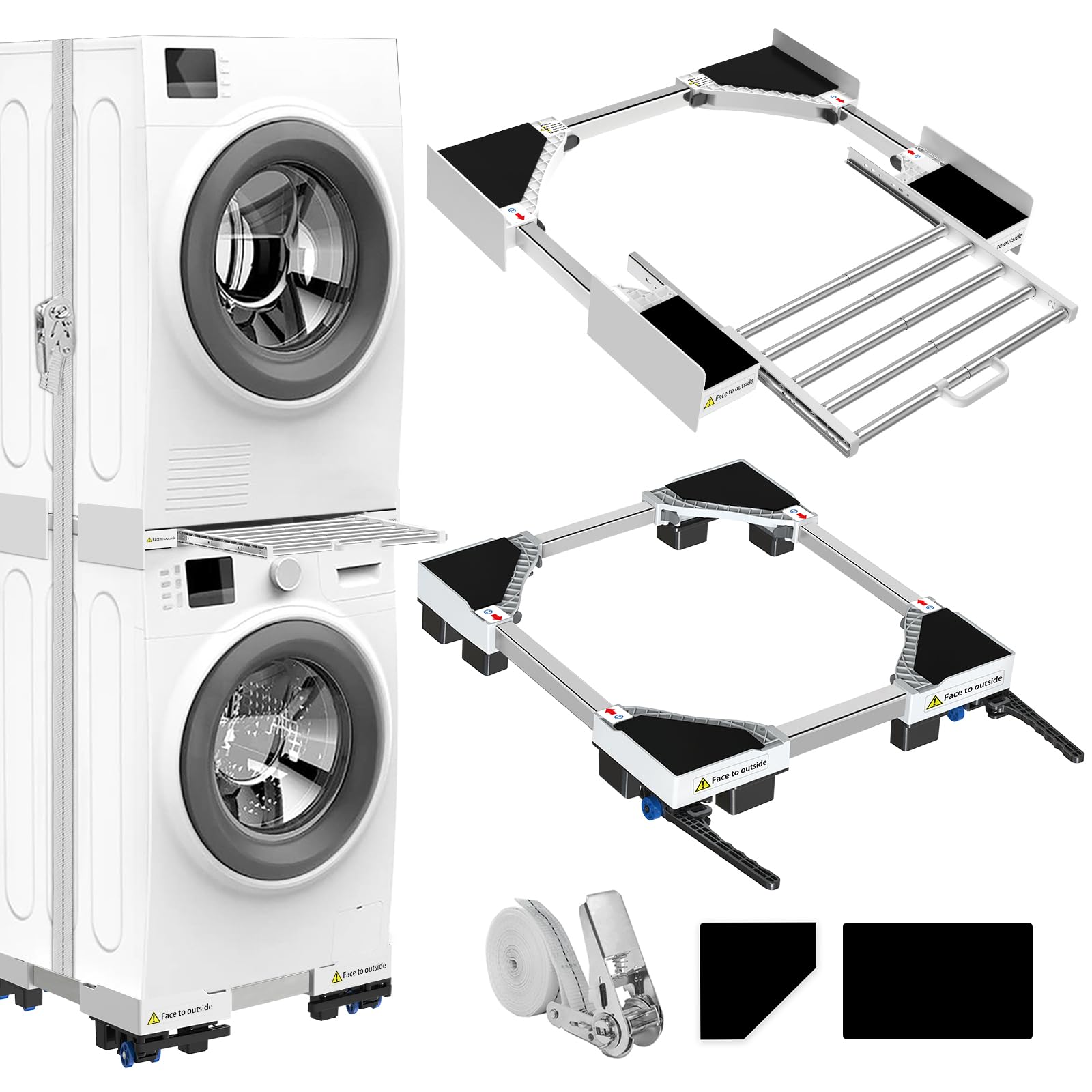 - Questo kit di impilamento e base mobile è progettato per un'ampia compatibilità, con dimensioni regolabili da 46-66 cm per il kit di impilamento e da 42-69 cm per la base, adattandosi a diverse marche di lavatrici e asciugatrici.