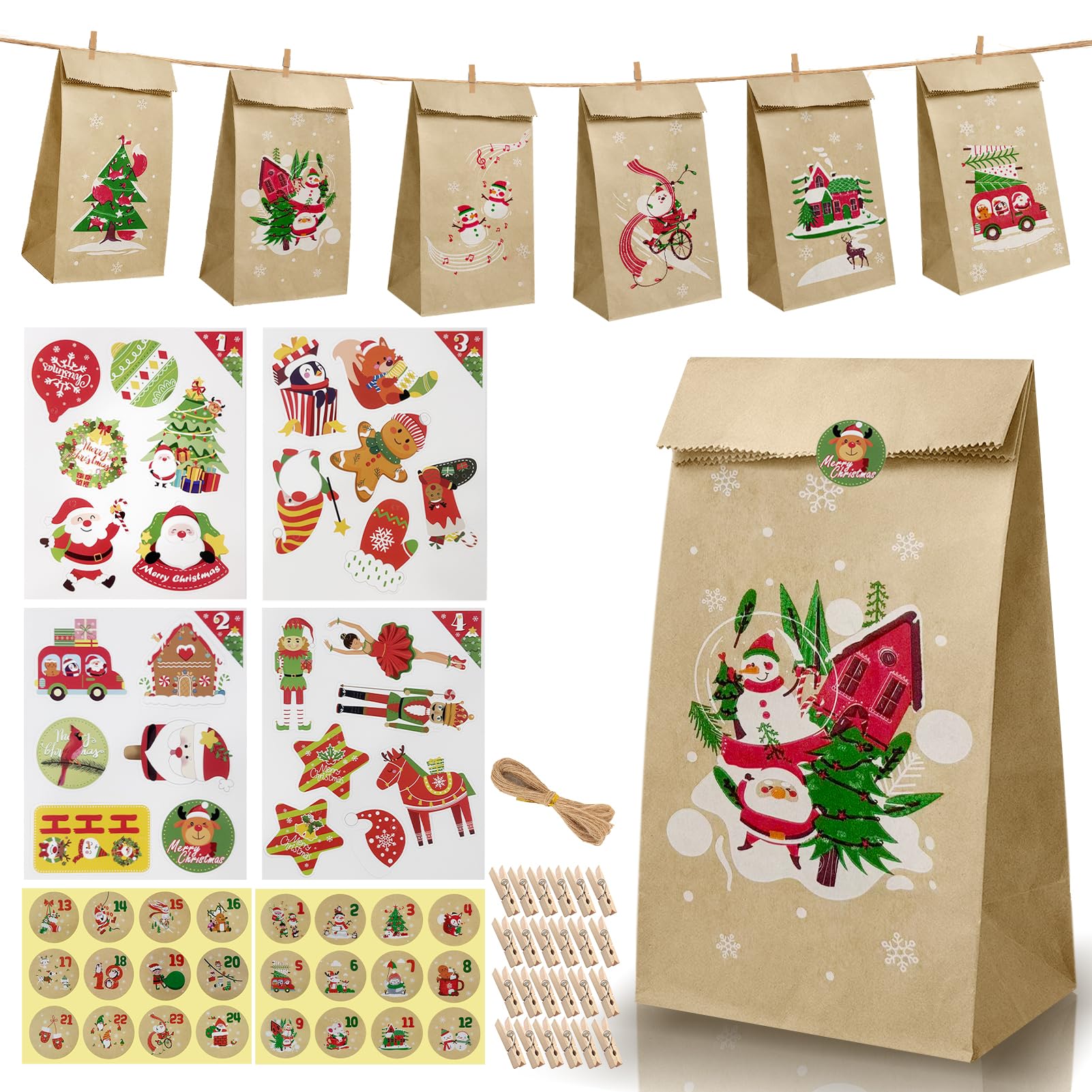 - Questo set per calendario dell'Avvento fai da te include 24 sacchetti di carta kraft, 25 etichette natalizie, 24 adesivi, 24 mollette e un filo lungo 10 metri, fornendo tutto il necessario per un regalo di Natale creativo.