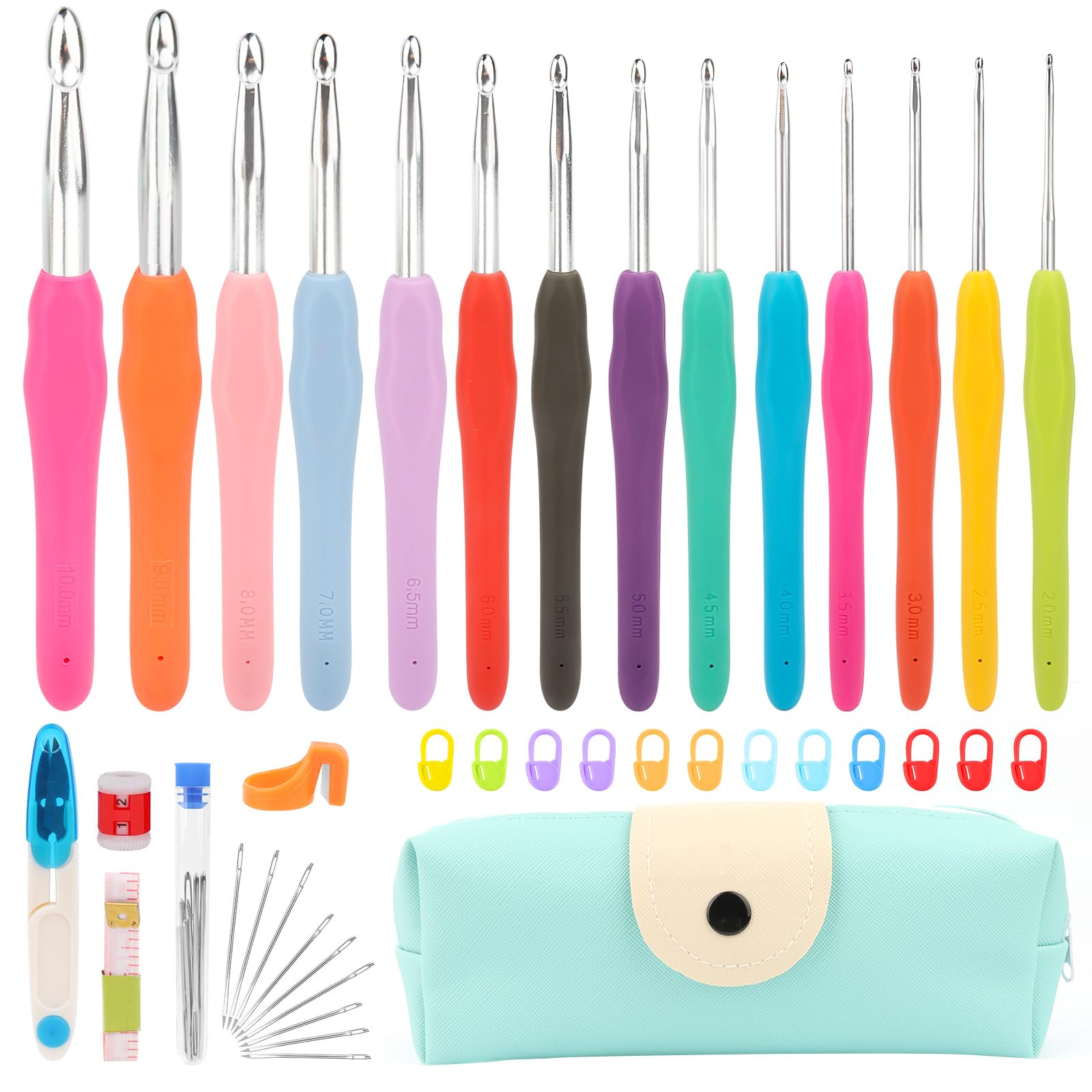- Il set deluxe da 39 pezzi include 14 uncinetti colorati con impugnatura in gomma (misure da 2 mm a 10 mm), 12 marcatori di punti, 9 aghi smussati con occhiello grande, 1 forbice, 1 contatore di file, 1 anello tagliafilo e 1 metro a nastro, coprendo tutte le necessità per vari progetti di maglia.