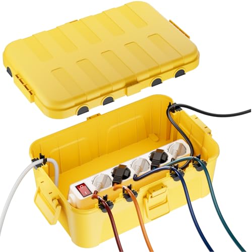 - Grazie alle 4 clip, al coperchio superiore e alle guarnizioni in gomma, questa scatola di copertura per cavi di prolunga da esterno è impermeabile IP54. Perfetto per sigillare cavi Ø1-12 mm, cavi intrecciati e fili piatti. Nota: la confezione NON include la ciabatta.