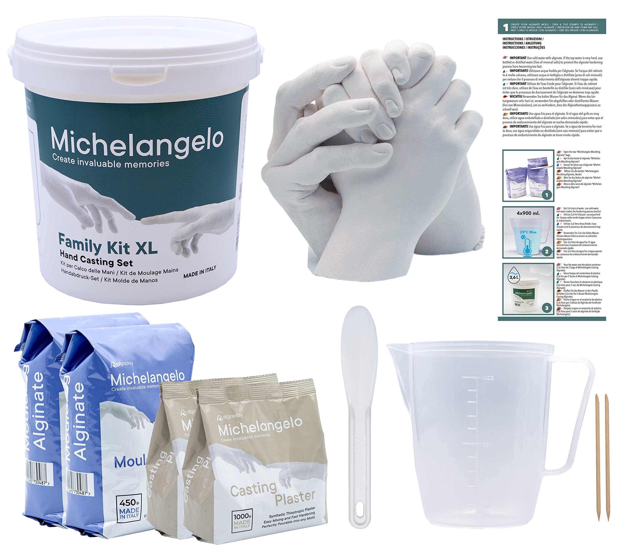 - Il kit include 900 grammi di Michelangelo Moulding Alginate, 2 kg di gesso sintetico tissotropico ad elevata durezza finale Michelangelo Casting Plaster, una caraffa graduata da 1 litro, una spatola di miscelazione e due bastoncini in legno per la pulizia della scultura, oltre a istruzioni illustrate in sei lingue.