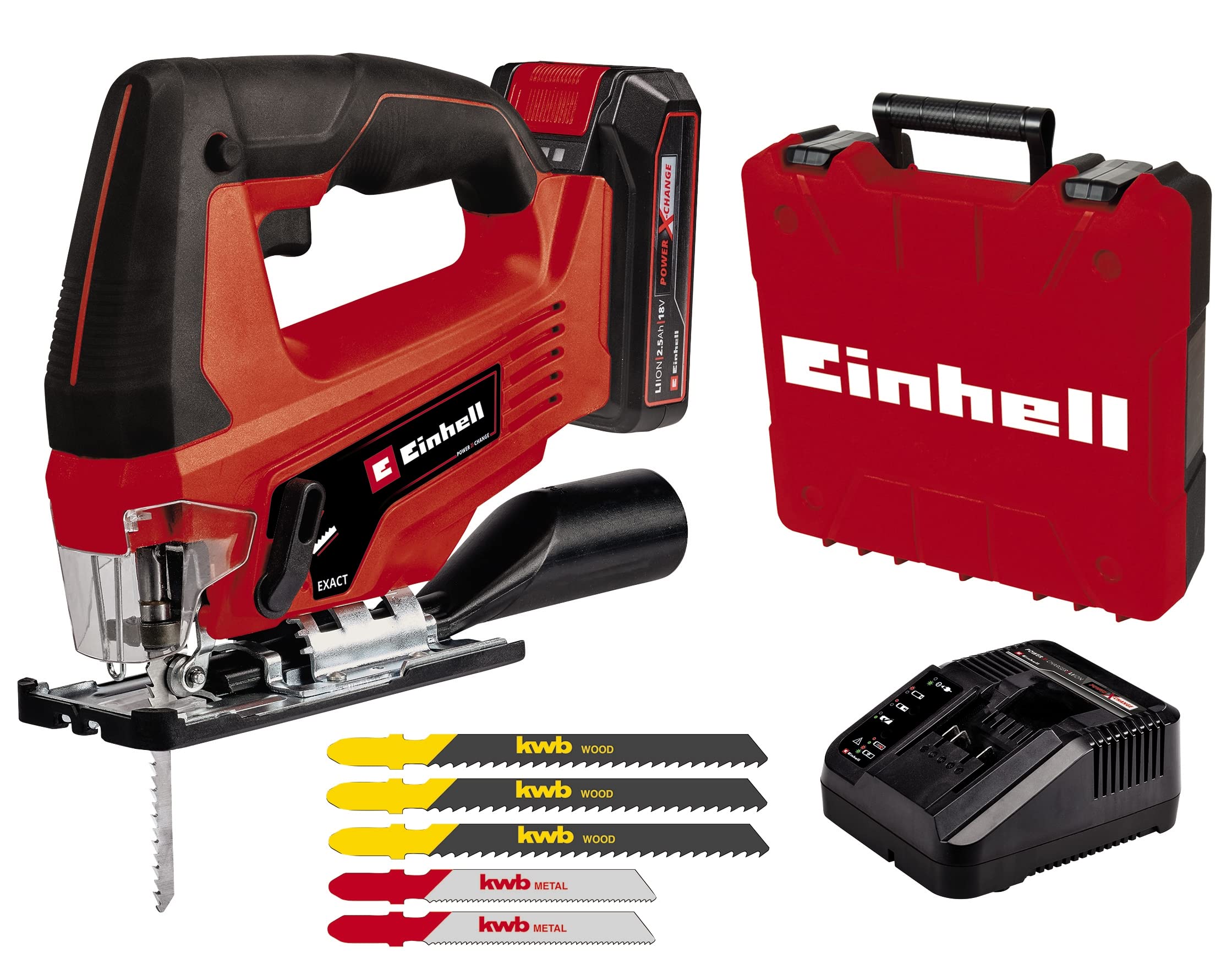 - Il seghetto a batteria TC-JS 18 Li (1x 2,5 Ah) fa parte della linea Power X-Change di Einhell, consentendo l'intercambiabilità di batterie e caricabatterie con altri utensili della stessa serie.
