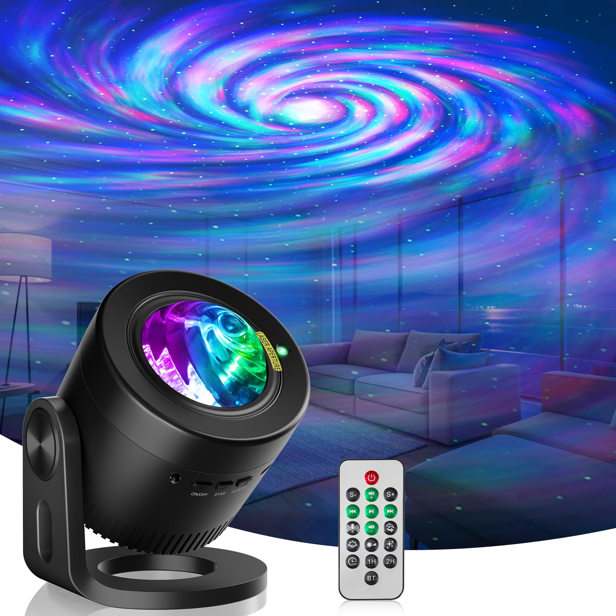 - Dotato di un telecomando, il proiettore Galaxy permette di controllare facilmente modalità luce, luminosità, volume e timer. Il supporto girevole a 180° consente di orientare la proiezione in qualsiasi direzione, coprendo un'area ultra-ampia da 15 a 60 metri quadrati, ideale per vari ambienti.