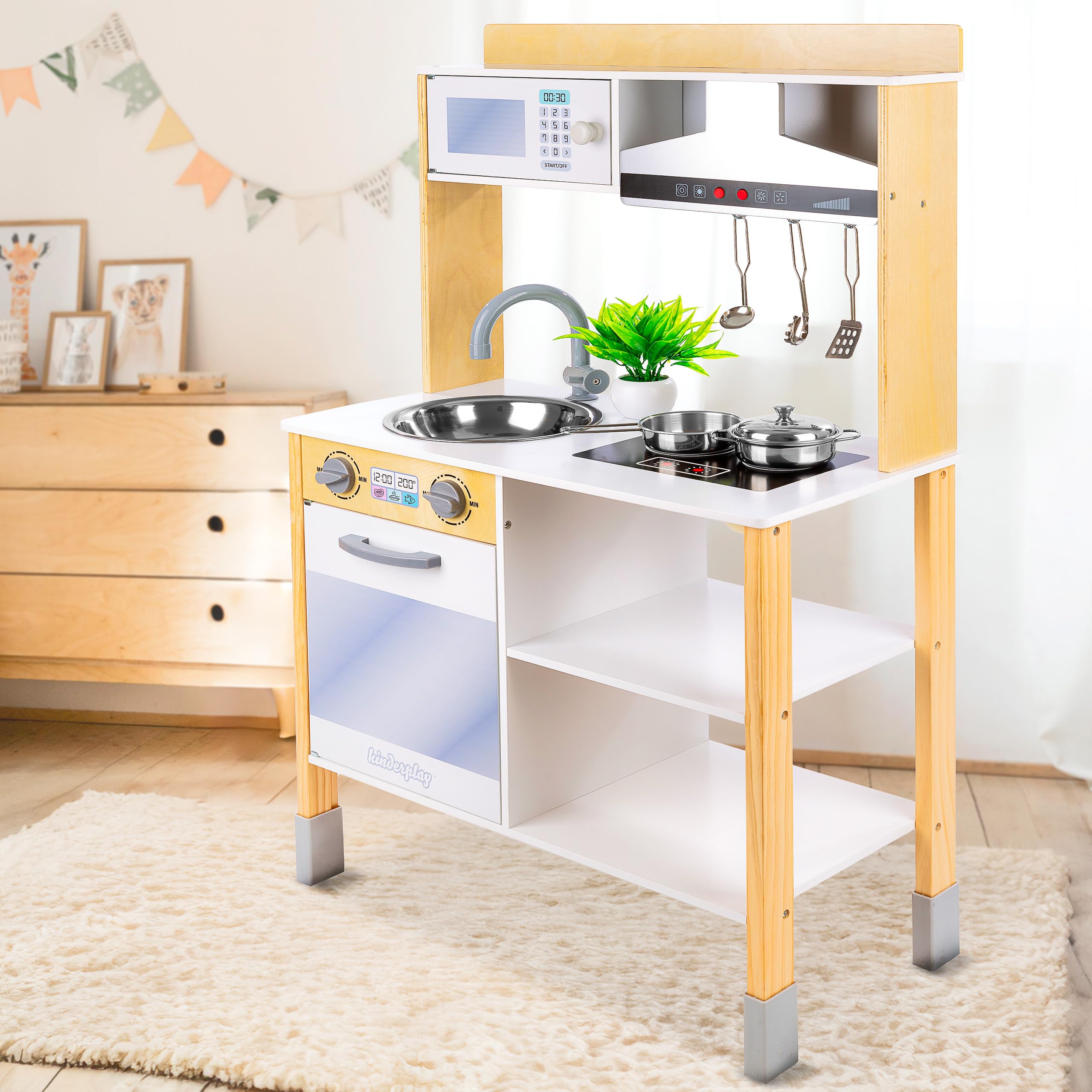 - Questa cucina per bambini in legno, alta 100 cm, è realizzata con legno di alta qualità per garantire durata, sicurezza e salute dei più piccoli, con una superficie liscia e senza spigoli vivi. Tutti gli elementi sono in legno, ad eccezione di maniglie, rubinetto e manopole in plastica.